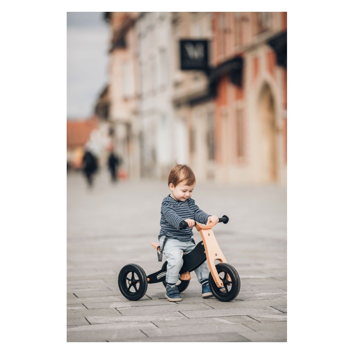 dřevěná tříkolka vhodná pro děti, které začínají objevovat svět mobility a rovnováhy