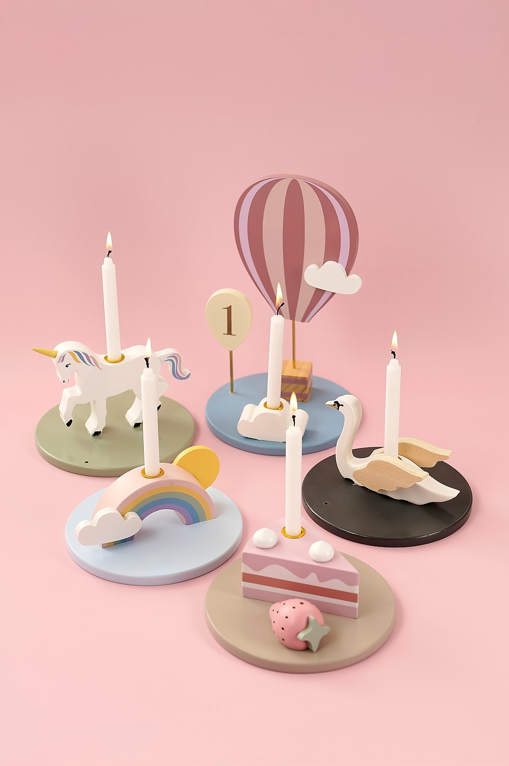 • Figury zahrnují labuť, duhu, horkovzdušný balón, narozeninový dort a jednorožce