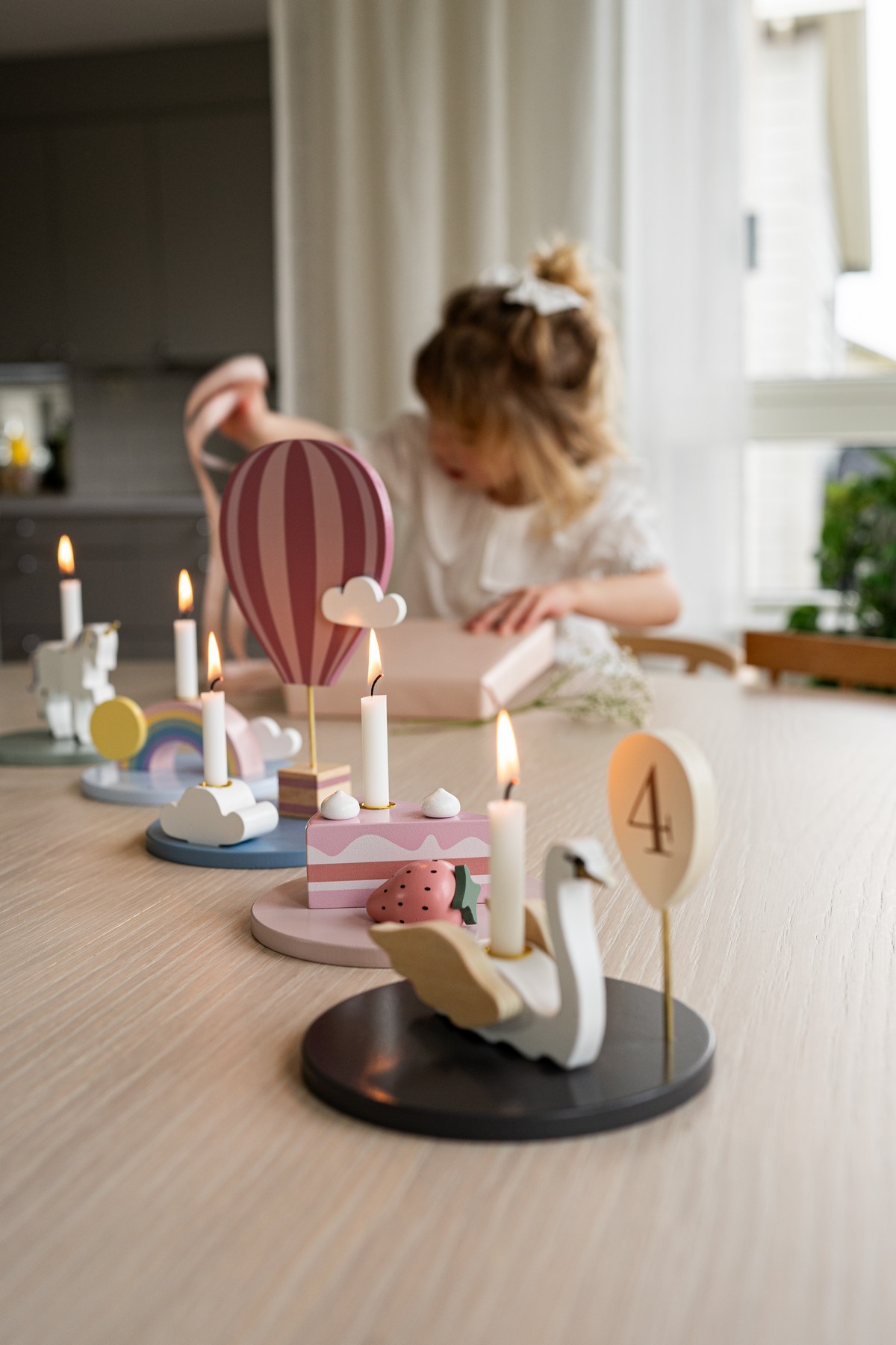 • Dřevěný narozeninový vláček složený z pěti svícnů – lze používat společně jako vláček nebo jednotlivě