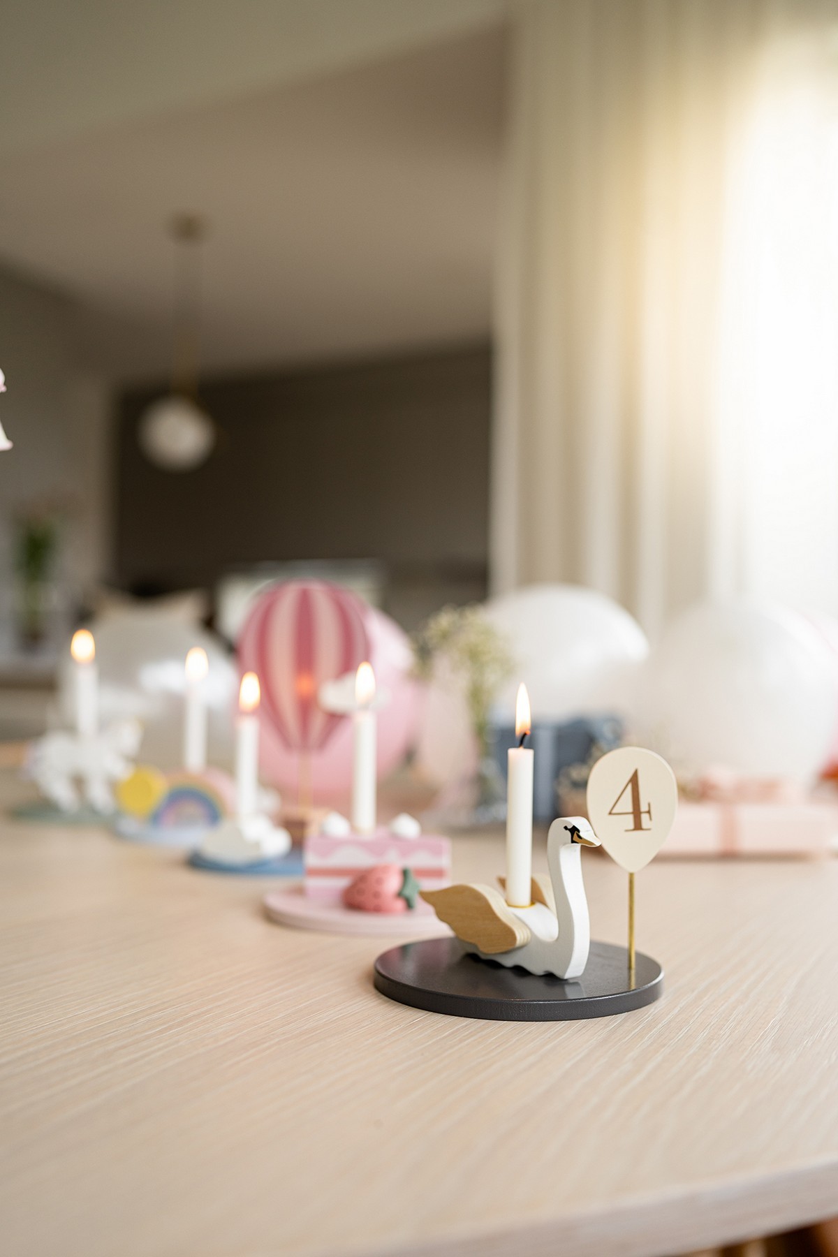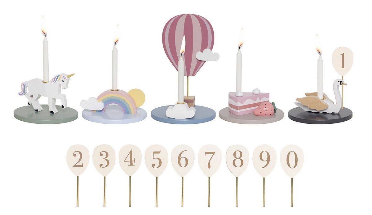 • Součástí jsou balónky s čísly 0–9, které lze připevnit ke svícnům a označit věk oslavence