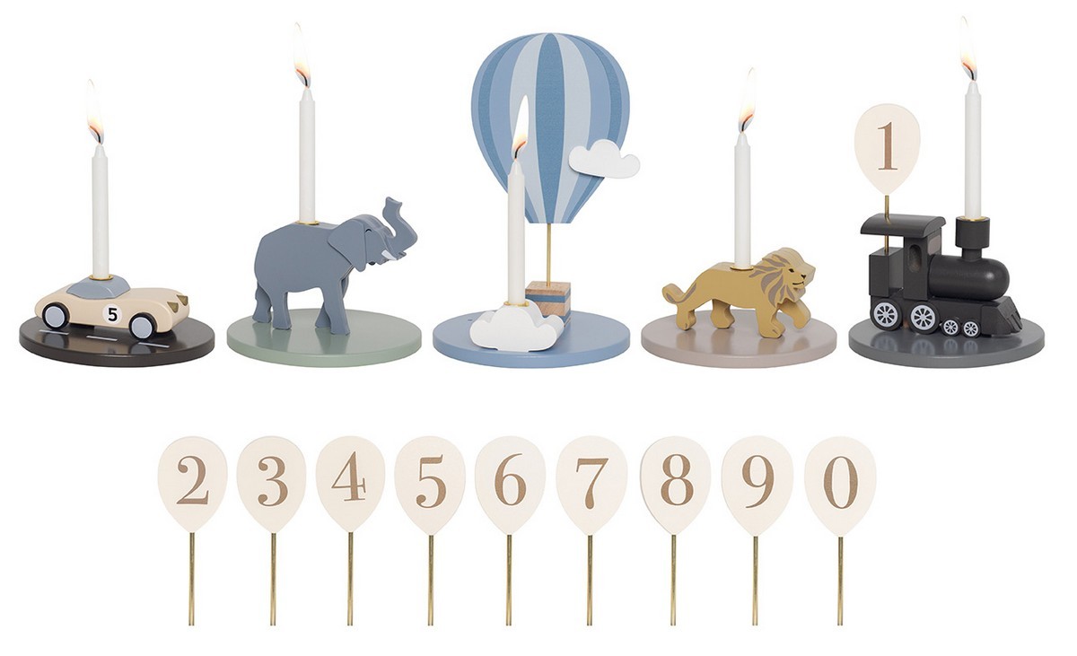• Součástí jsou balónky s čísly 0–9, které lze připevnit ke svícnům a označit věk oslavence