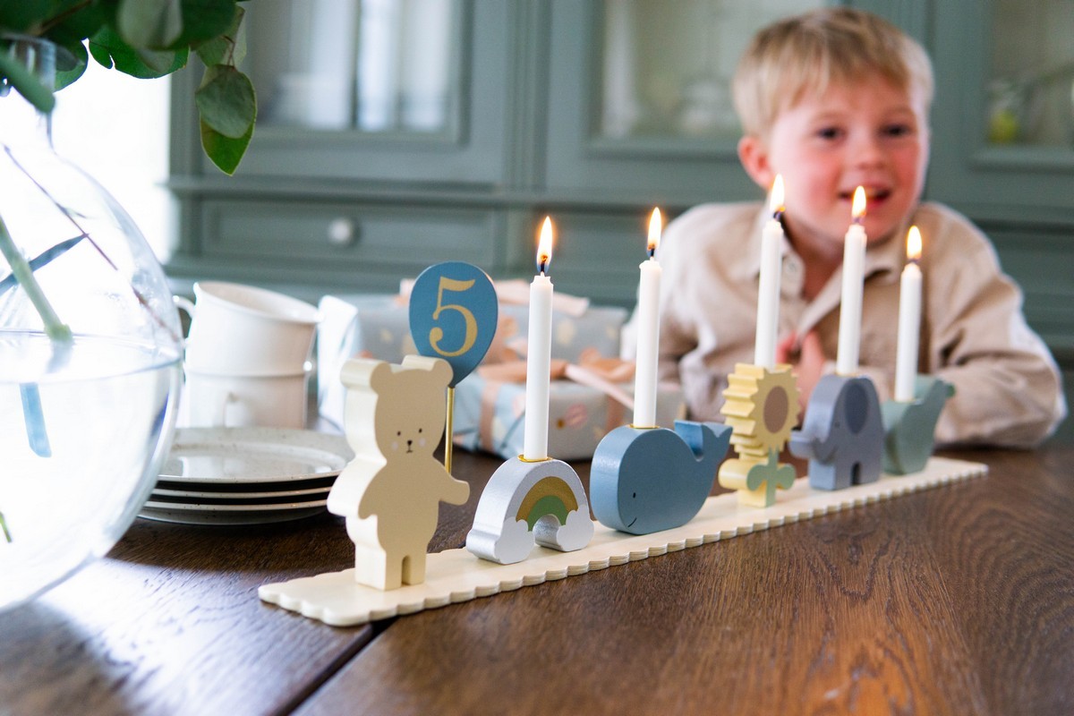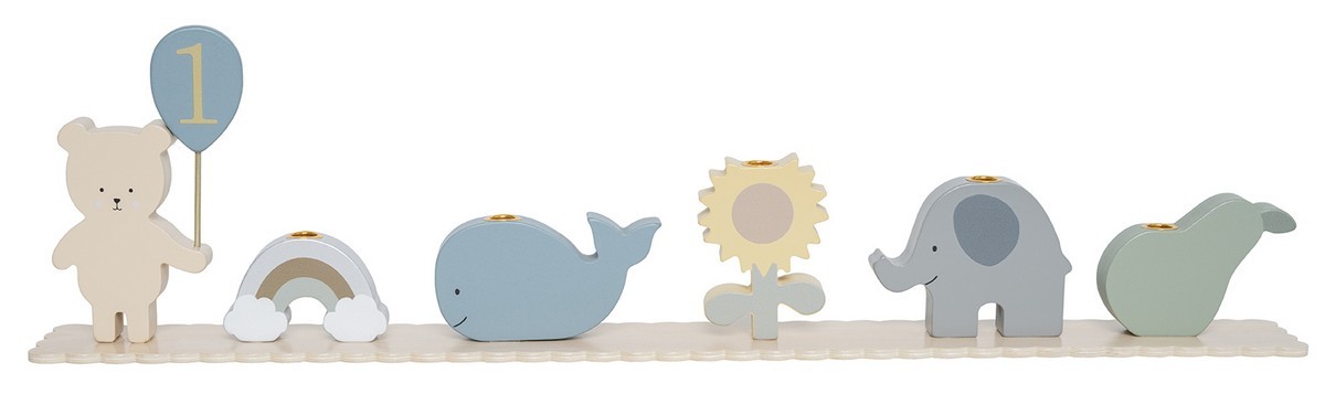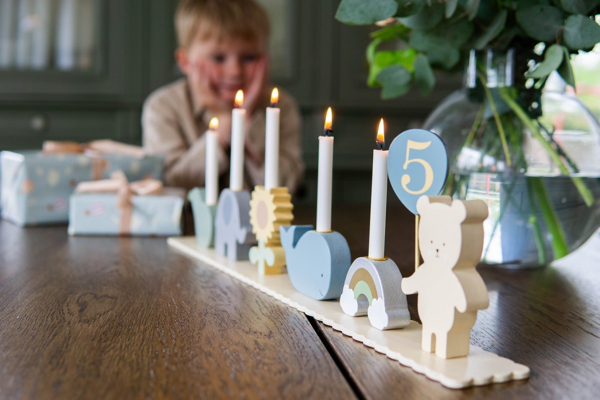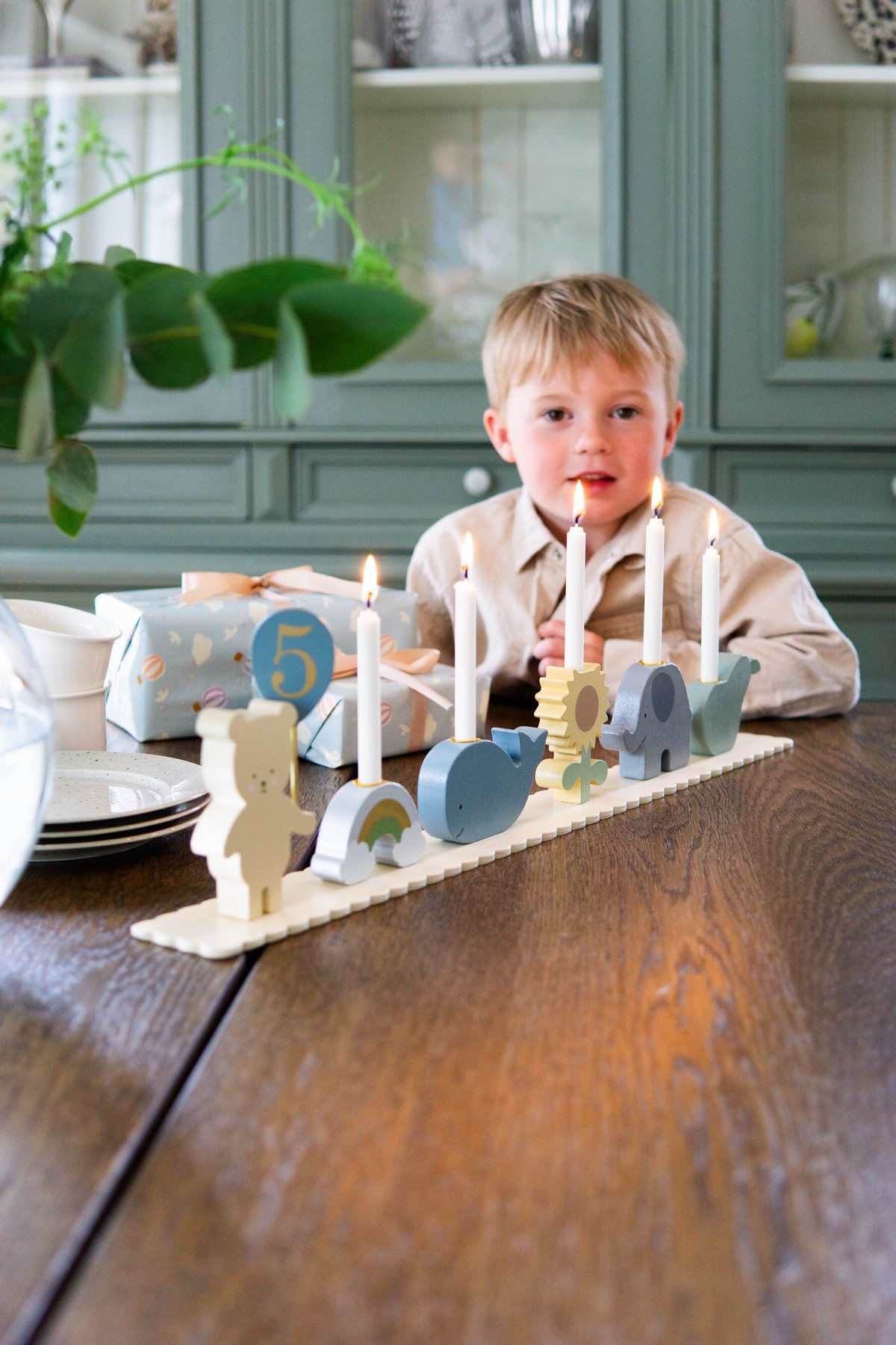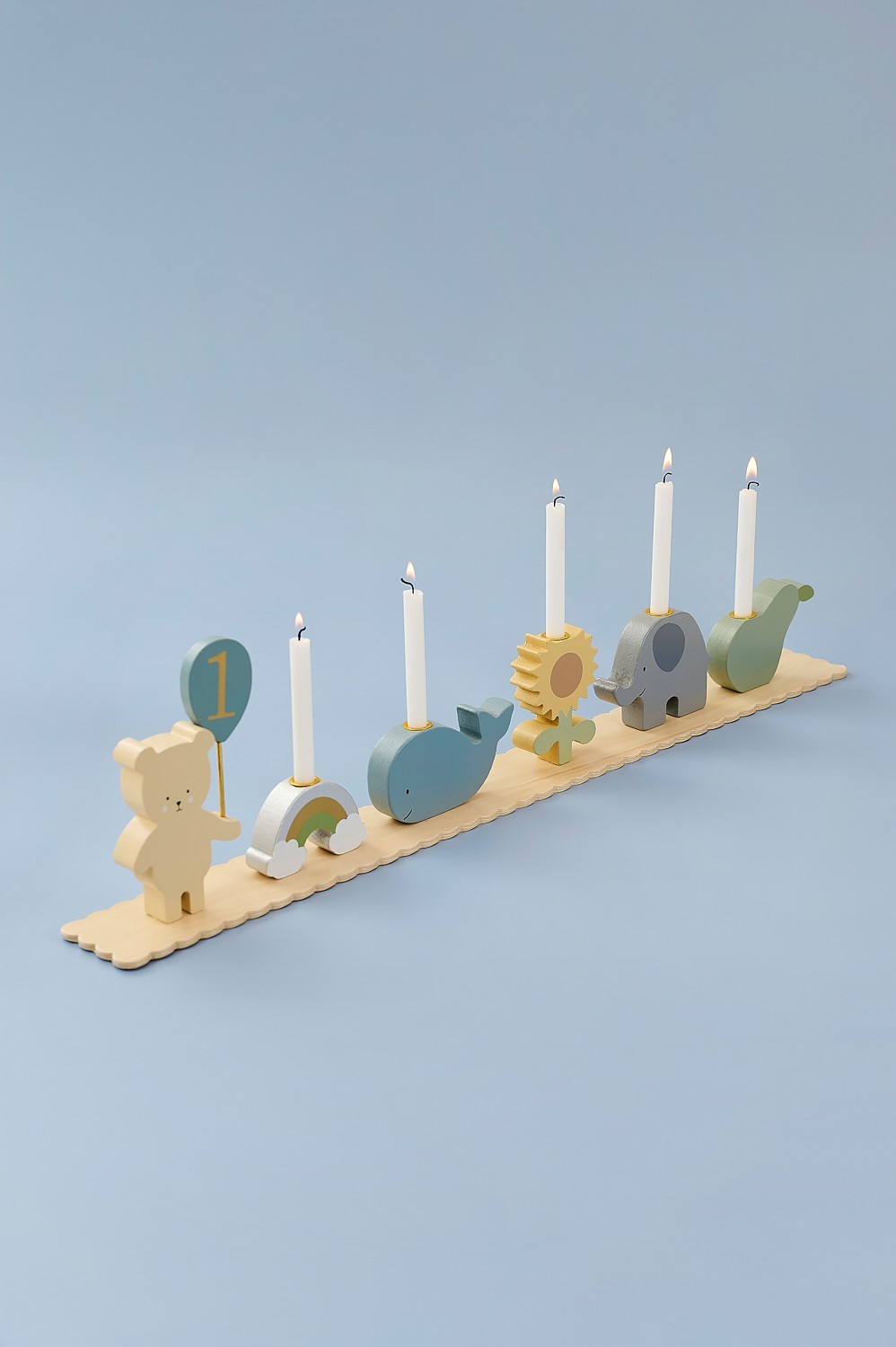 • Dřevěný narozeninový vláček s pěti svícny a roztomilými postavičkami – Teddy, duha, velryba, slunečnice, slon a hruška