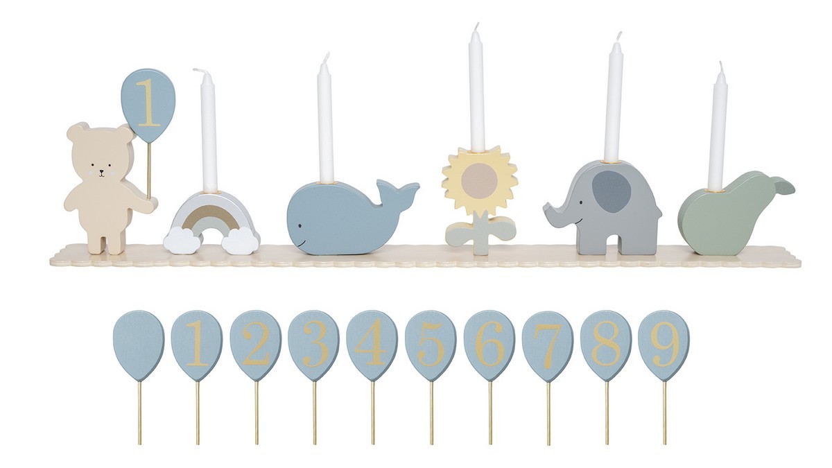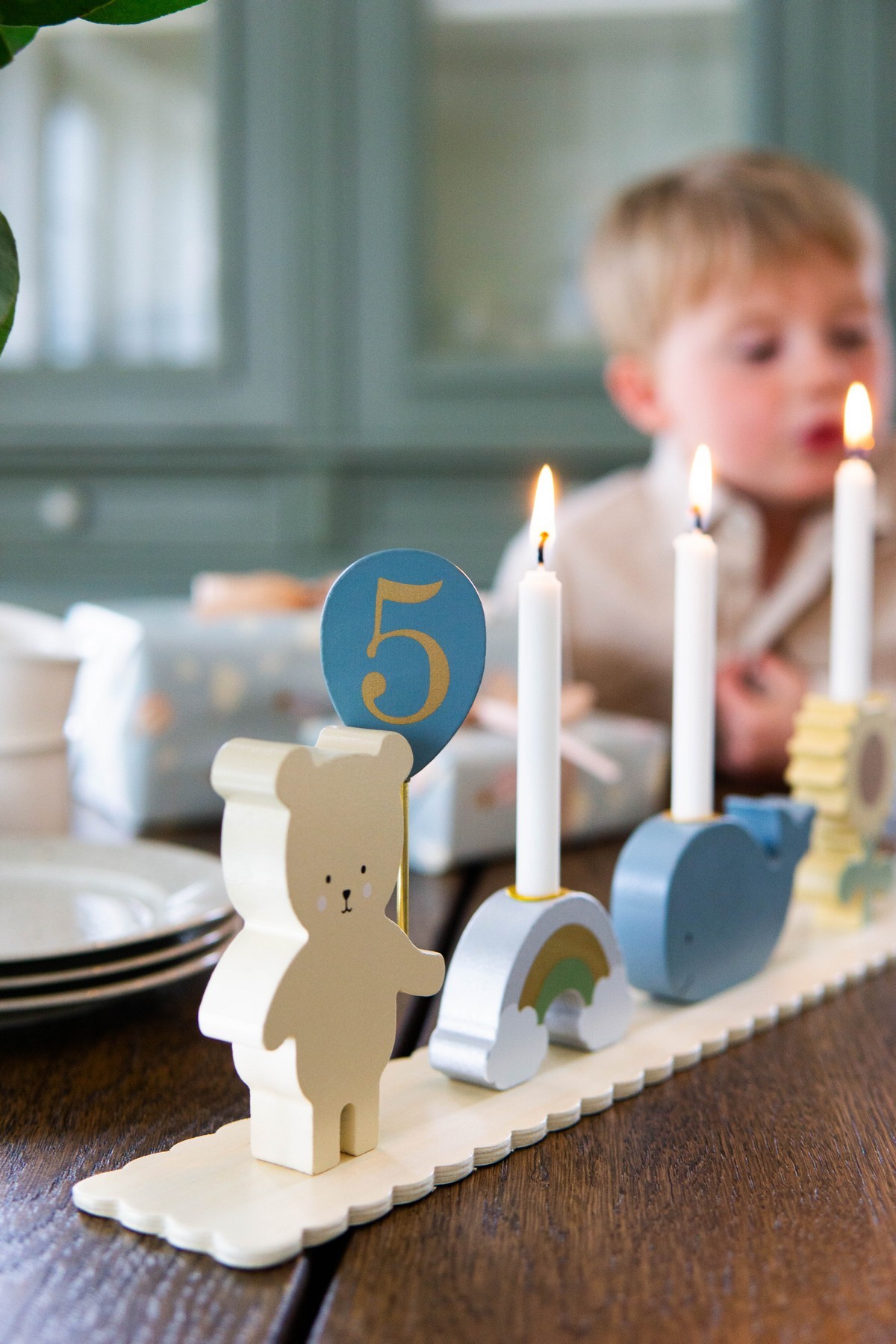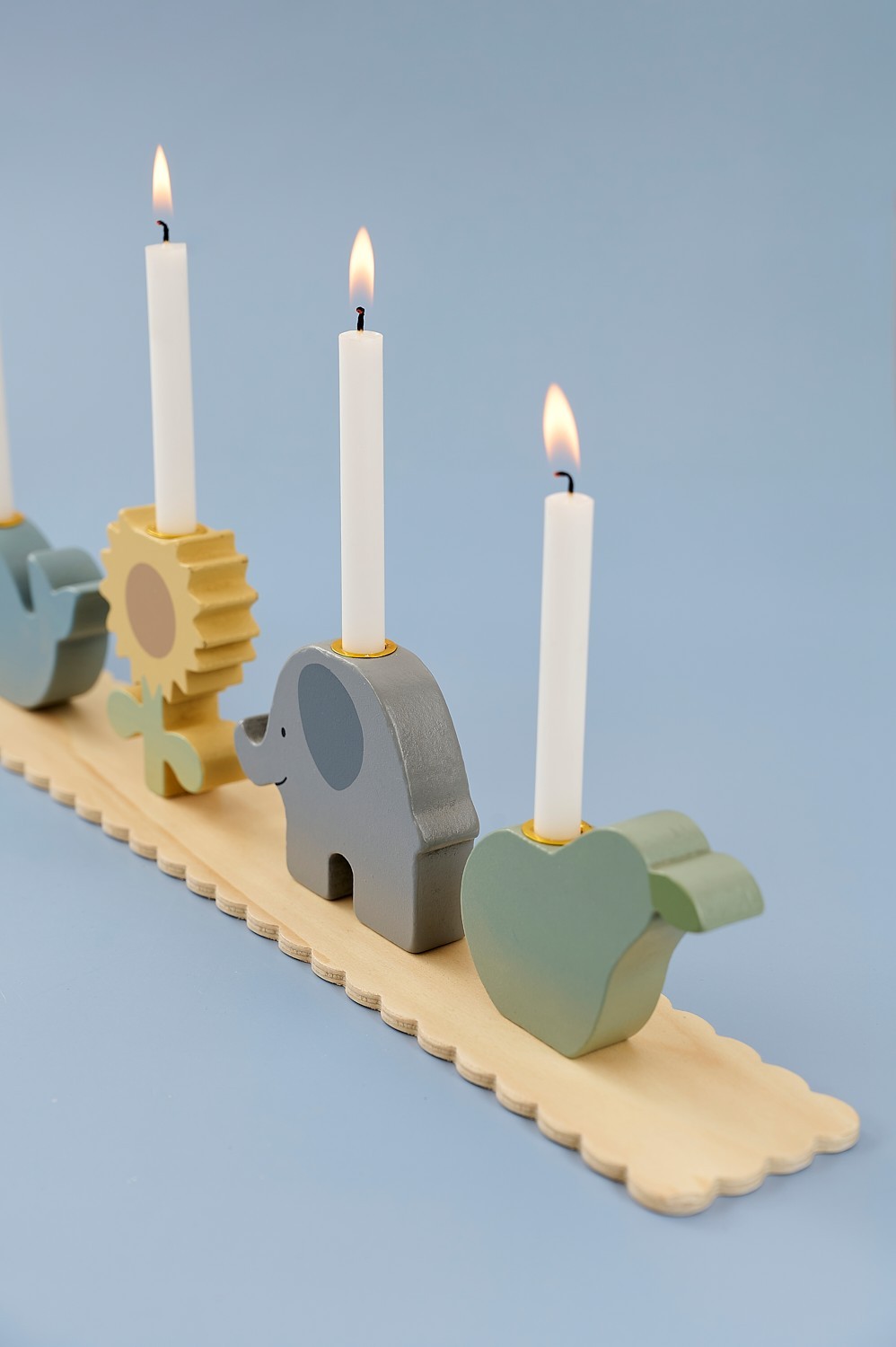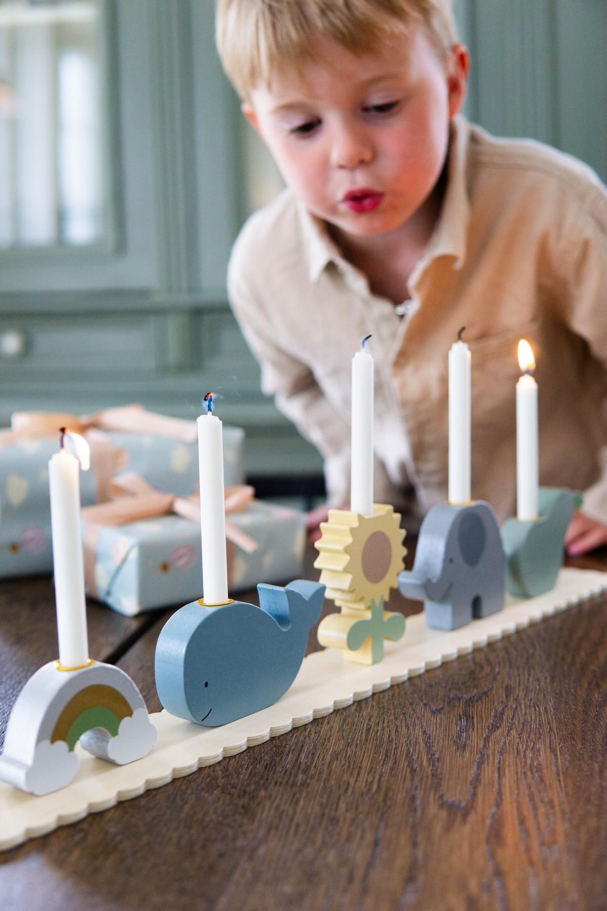 • Dřevěný narozeninový vláček s pěti svícny a roztomilými postavičkami – Teddy, duha, velryba, slunečnice, slon a hruška