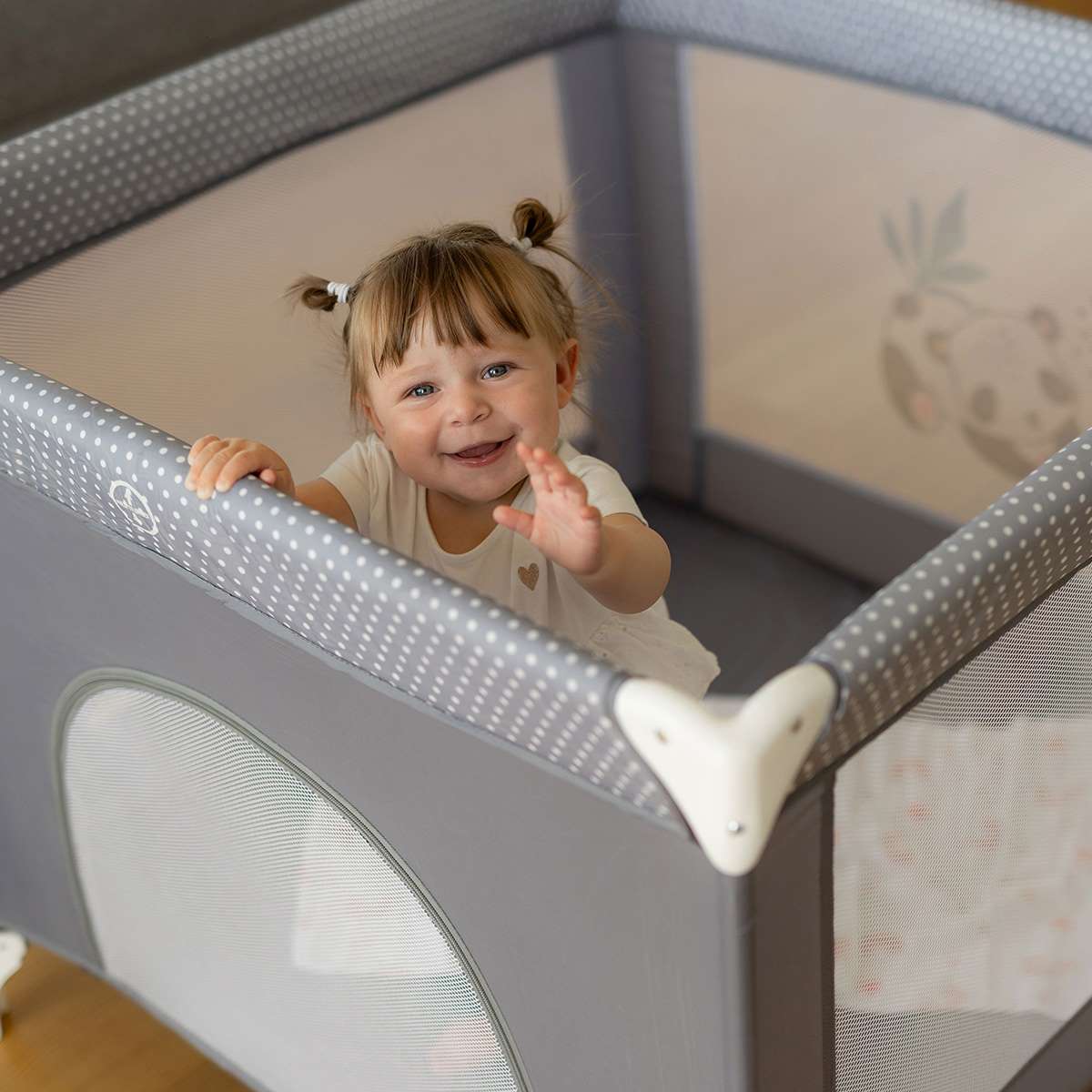 • všechny čtyři strany ohrádky jsou opatřeny síťovinou, která zajišťuje lepší ventilaci a umožňuje rodičům snadnější dohled nad dítětem