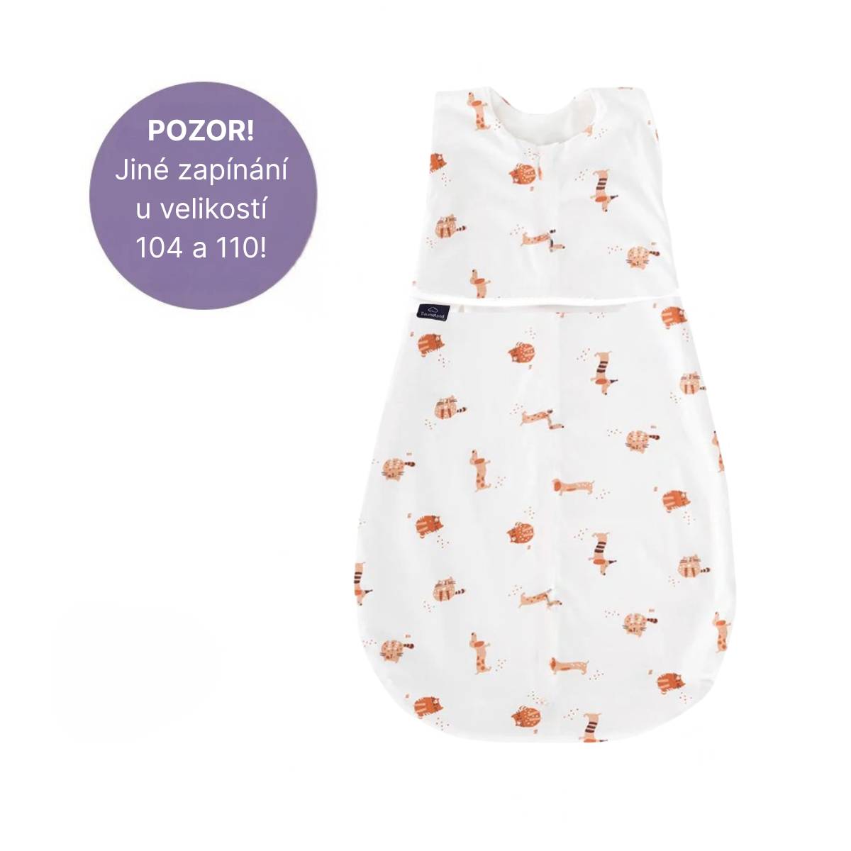 • Velikosti 104 a 110 – již nejsou rostoucí; druky jsou zde jen na jedné straně a slouží pro pohodlné nasazování spacího pytle.