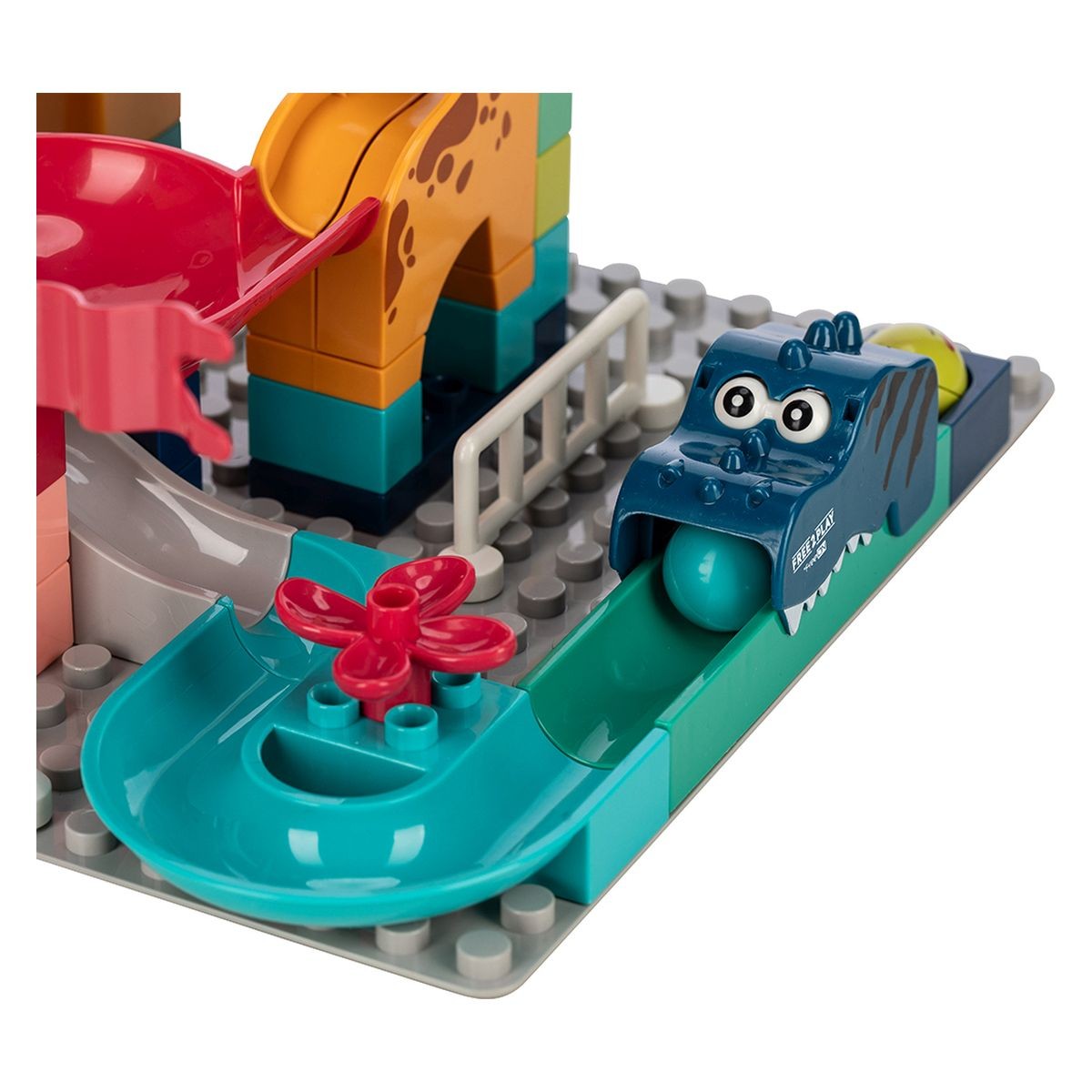 obsahuje pohyblivé části pro rozvoj koordinace, barevné figurky pro hru na role, spojovací prvky pro stavbu různých konstrukcí a dráhu pro kuličku pro objevování gravitace
