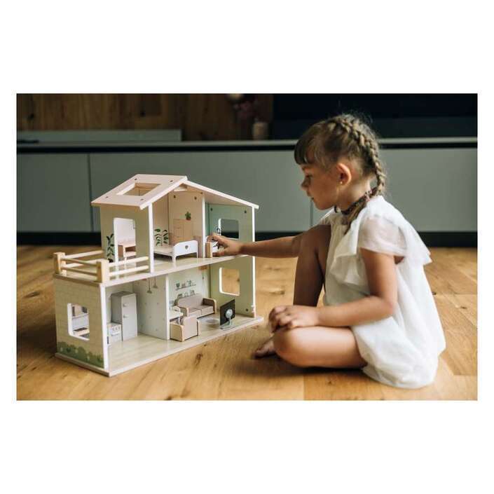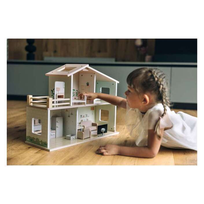 součástí balení: stůl, 2 židličky, kuchyňská linka, sedačka, křeslo, malý regál, televizor, postel, noční stolek, vana, záchod, koupelnový blok