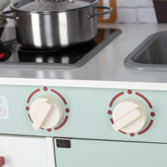 Připravte svému dítěti nezapomenutelný zážitek s touto kouzelnou dřevěnou kuchyňkou, která zaručeně zabaví a rozproudí jeho fantazii! S touto kuchyňkou se každý malý kuchař promění v mistra kulinářského umění. Díky zvukovým a světelným efektům, jako je bublání vody na sporáku nebo světélkující varná deska a digestoř, bude každé vaření jako v opravdové kuchyni! Součástí jsou 2 dřevěné vařečky a 2 kovové hrníčky, aby mohl váš malý šéfkuchař začít ihned vařit. Zásuvky pod dřezem, troubou a mikrovlnkou se navíc otevírají, což dává hře ještě více realismu a zábavy.