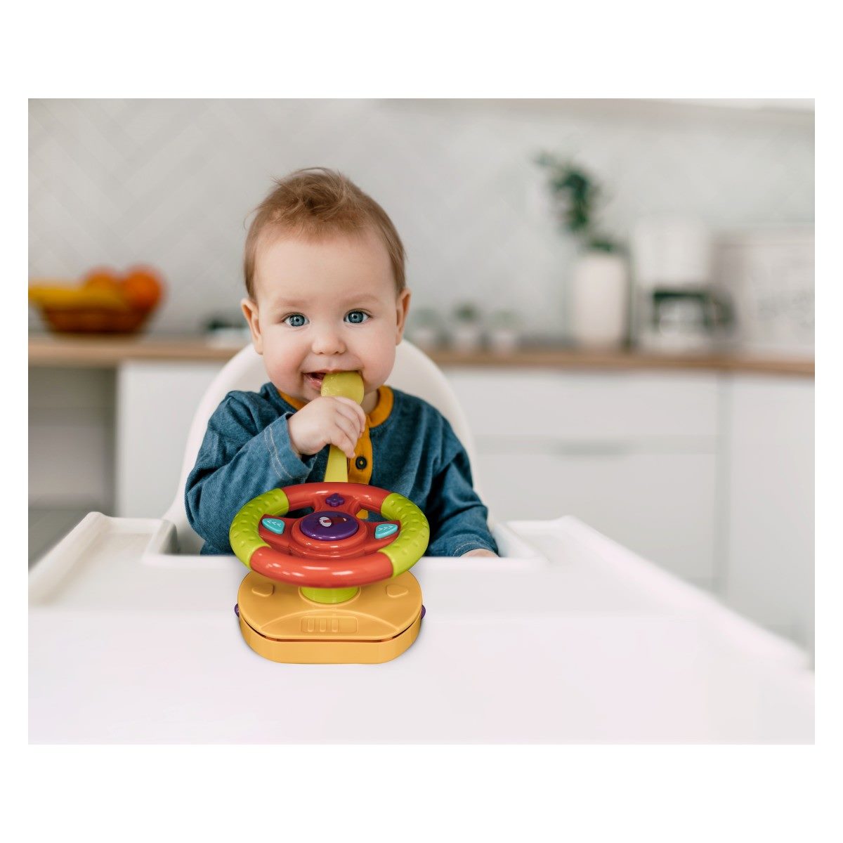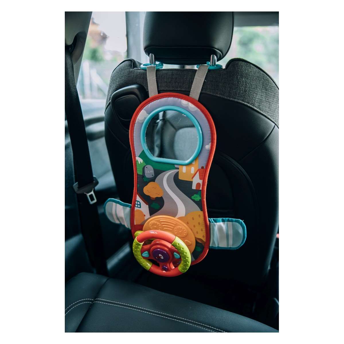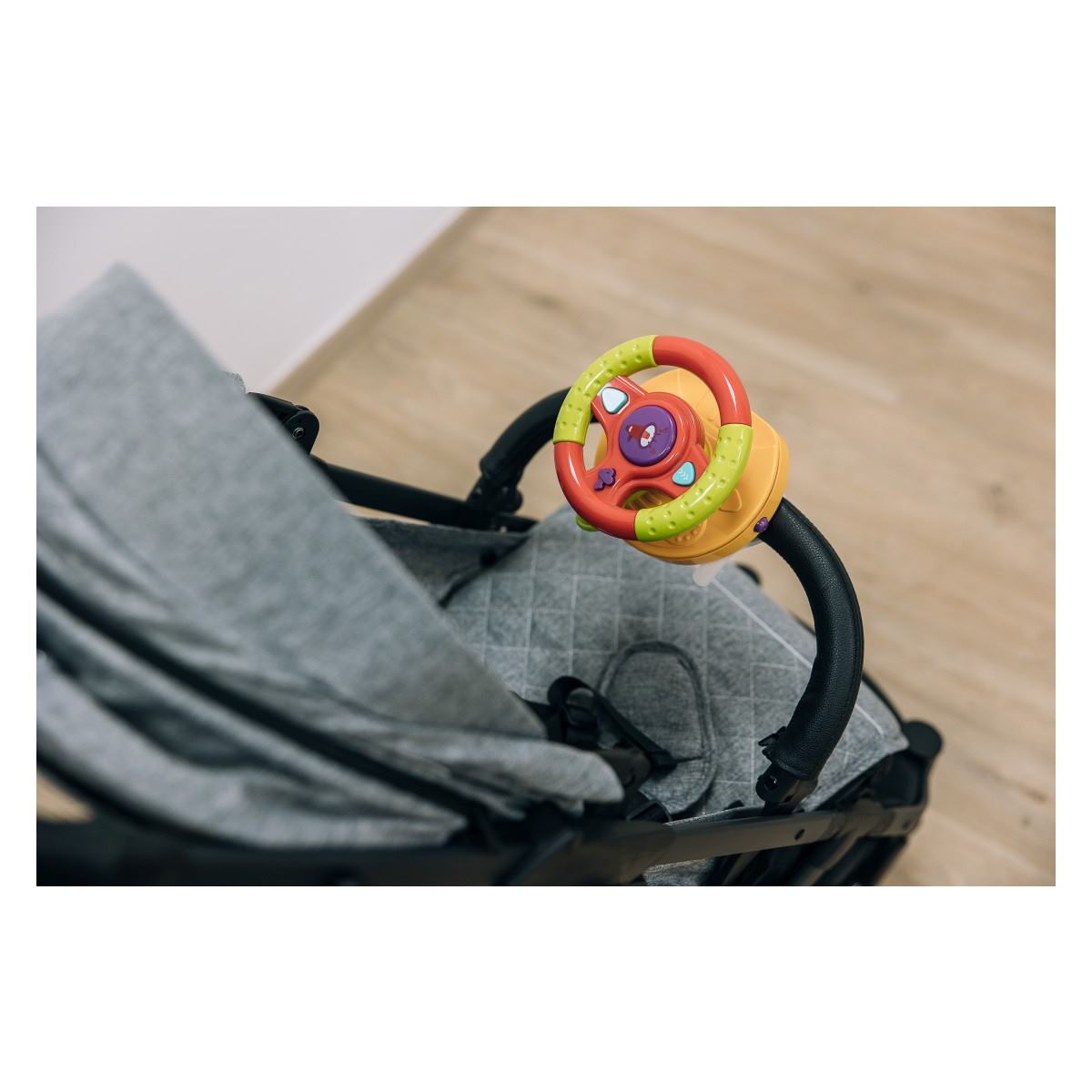 obsahuje klipy a přezky, díky nimž lze volant připevnit na autosedačku nebo kočárek, což dělá řízení ještě zábavnějším