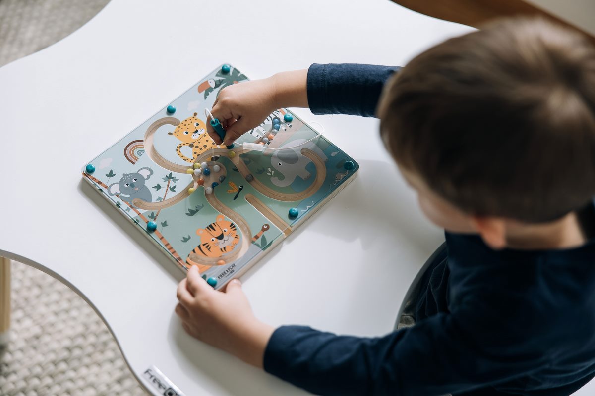 dítě pomocí tyčinky vede kuličky bludištěm až k cíli