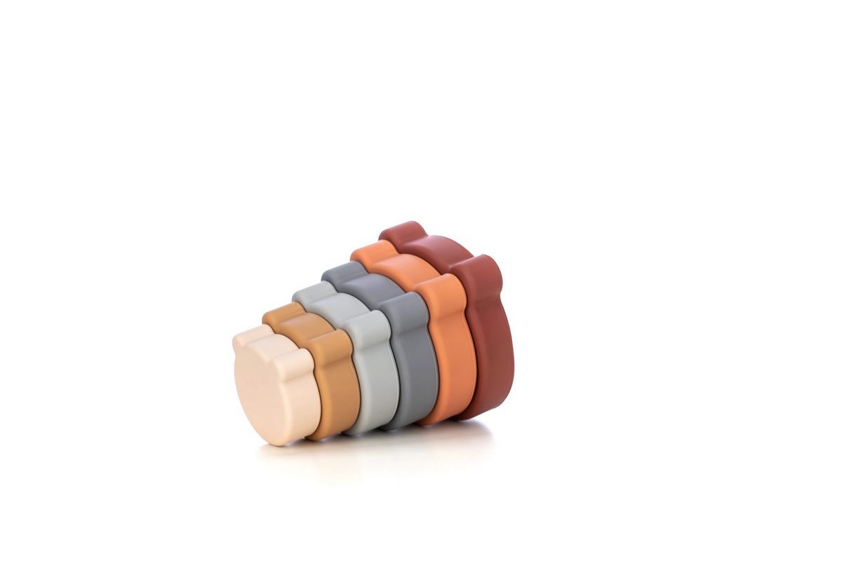 sada obsahuje 7 různě barevných a velikostí silikonových stavebních bloků, které lze skládat na sebe