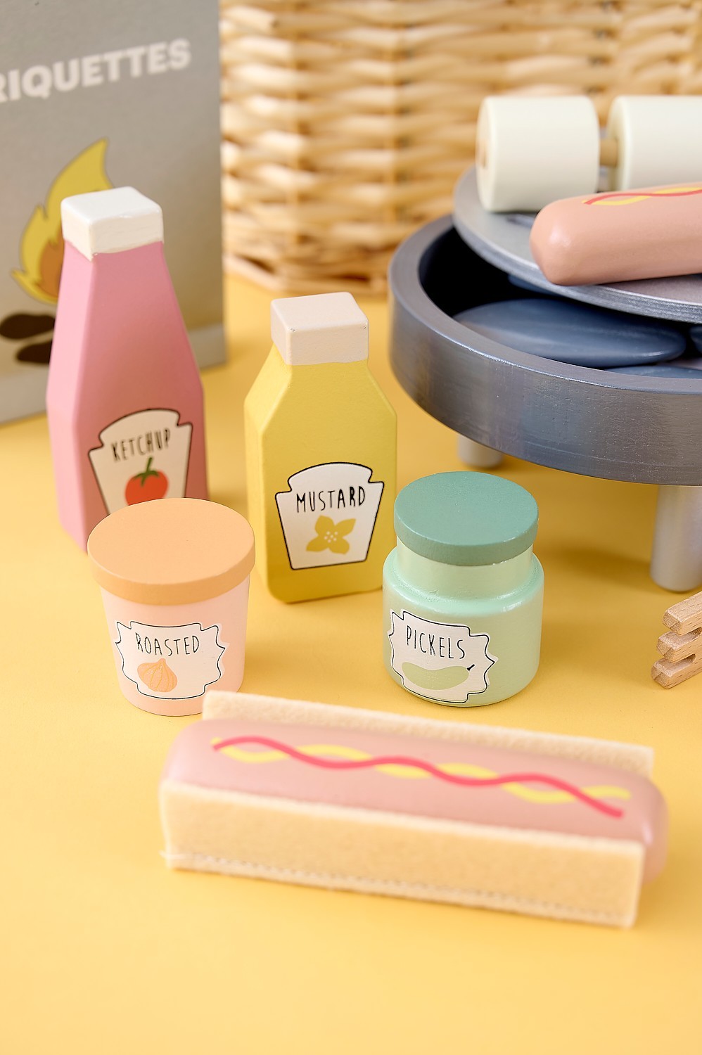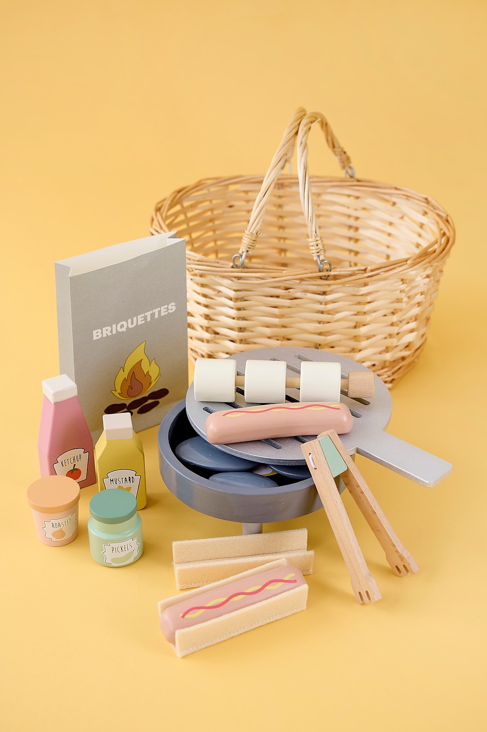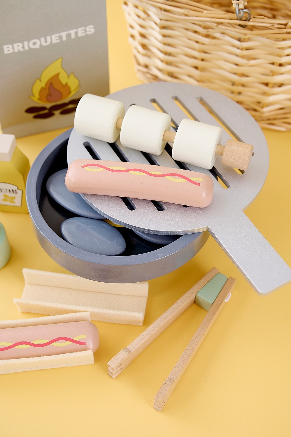 • Součástí jsou také lahvičky s kečupem a hořčicí, sklenice s okurkami a restovanou cibulí, grilovací kleště a špíz s marshmallows