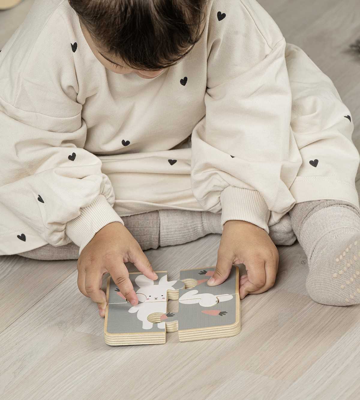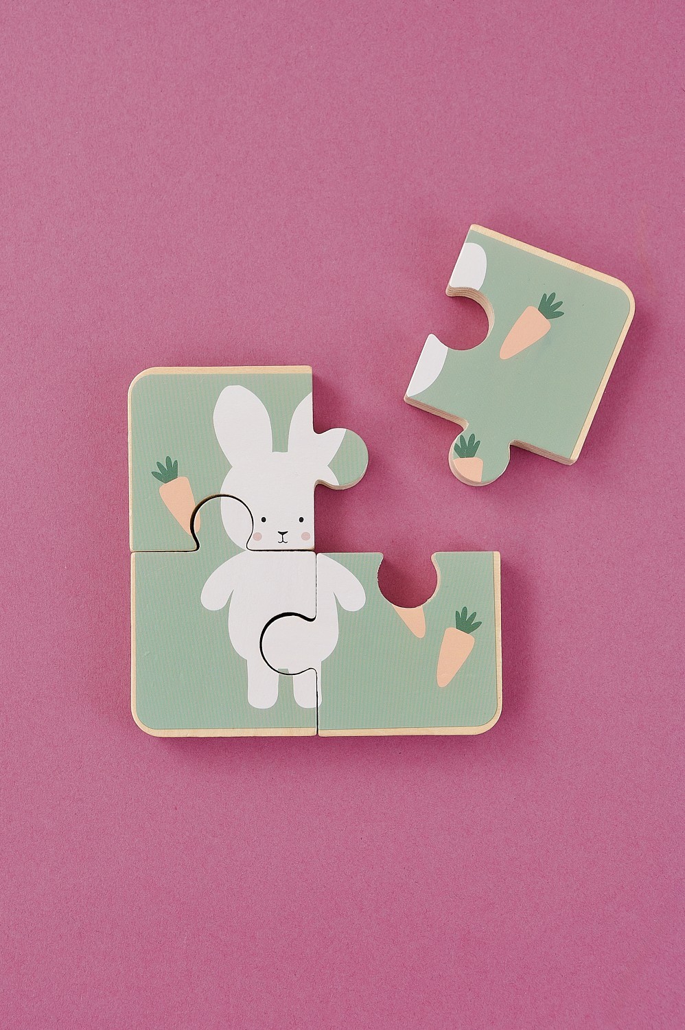 Dvouvrstvé puzzle: jedna strana s barevným puzzle pro rozvoj fantazie a kreativity, druhá strana s králičím motivem pro procvičování správných vzorců a řešení problémů