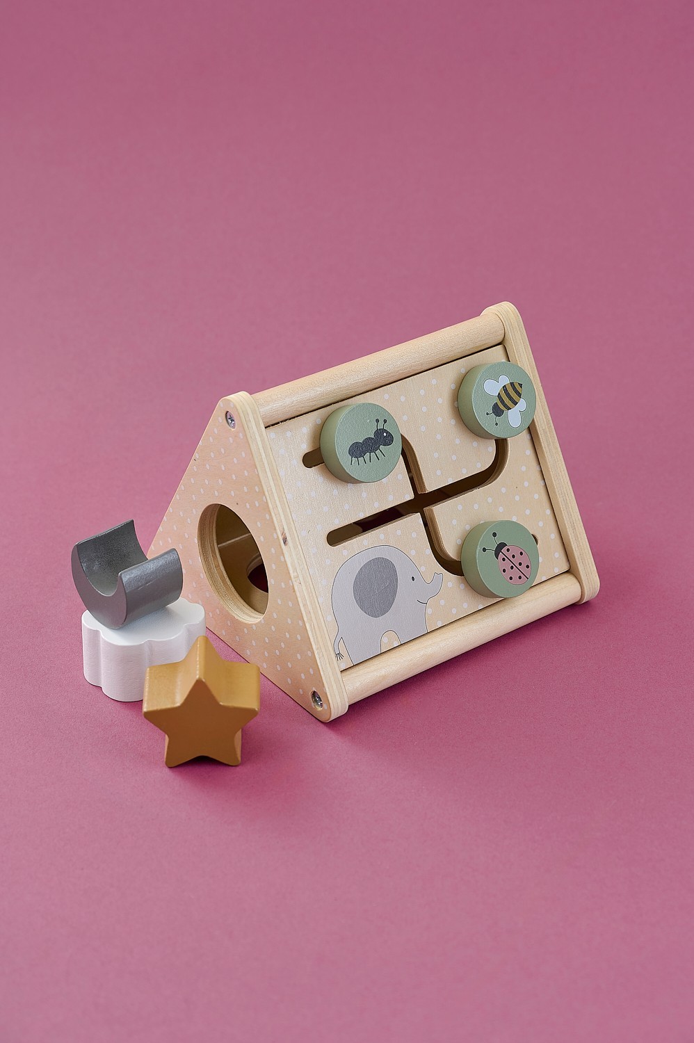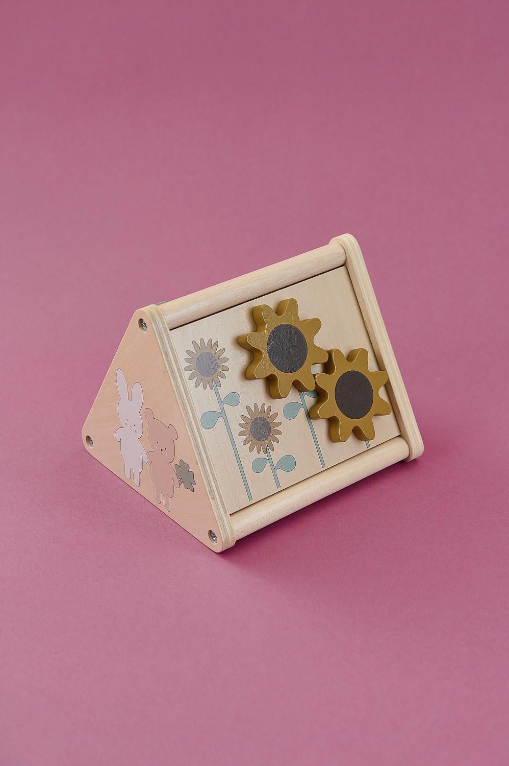 Aktivity trojúhelník: rozvíjí poznávání tvarů, logické myšlení, jemnou motoriku a koordinaci, obsahuje ozubená kolečka s květinovým motivem, pohybující se hmyz v bludišti a tři tvarově odlišné bloky pro třídění