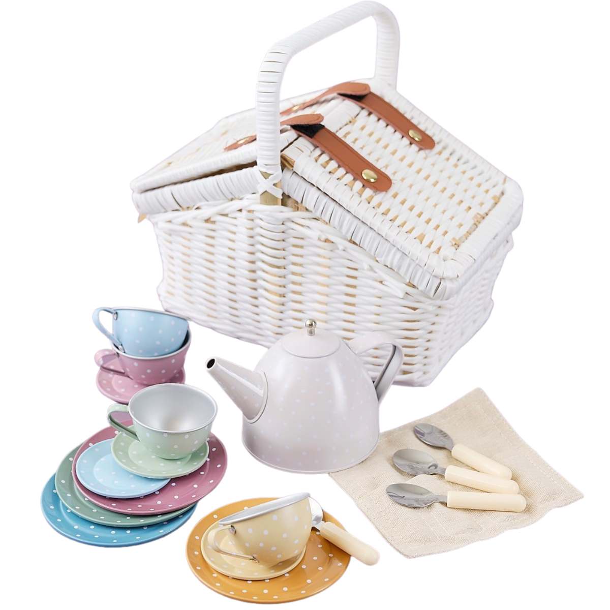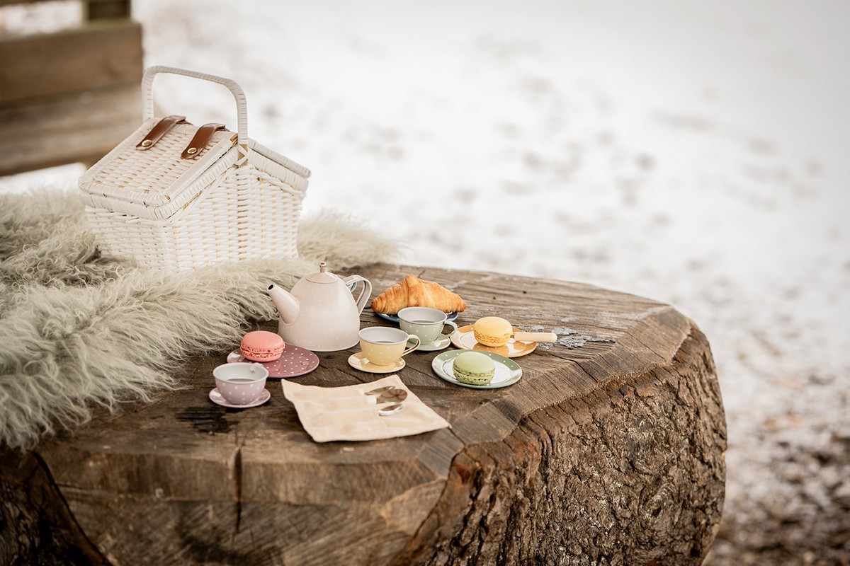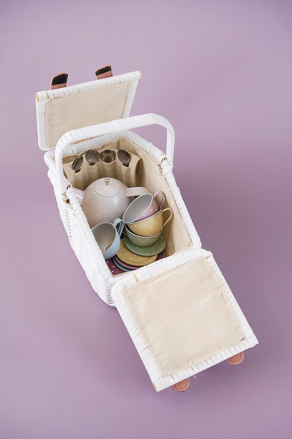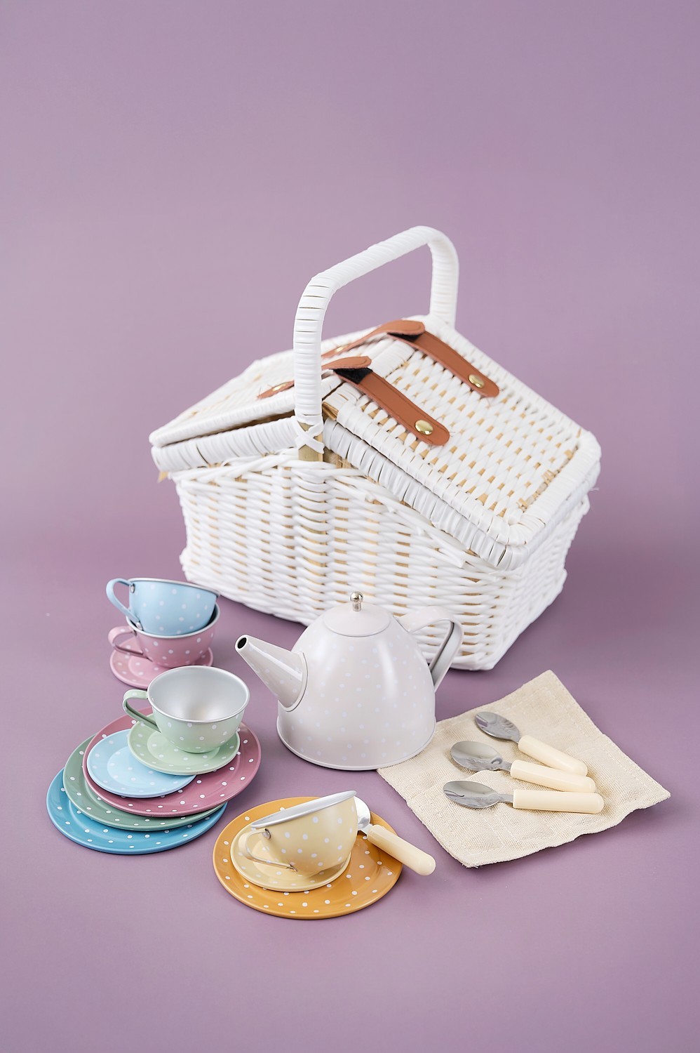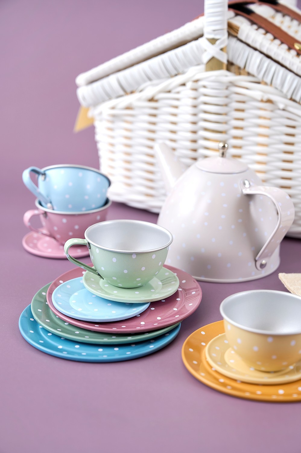 • Obsah balení: čajová konvička, 4 šálky, 4 podšálky, 4 talířky na dezerty, 4 lžičky, piknikový košík