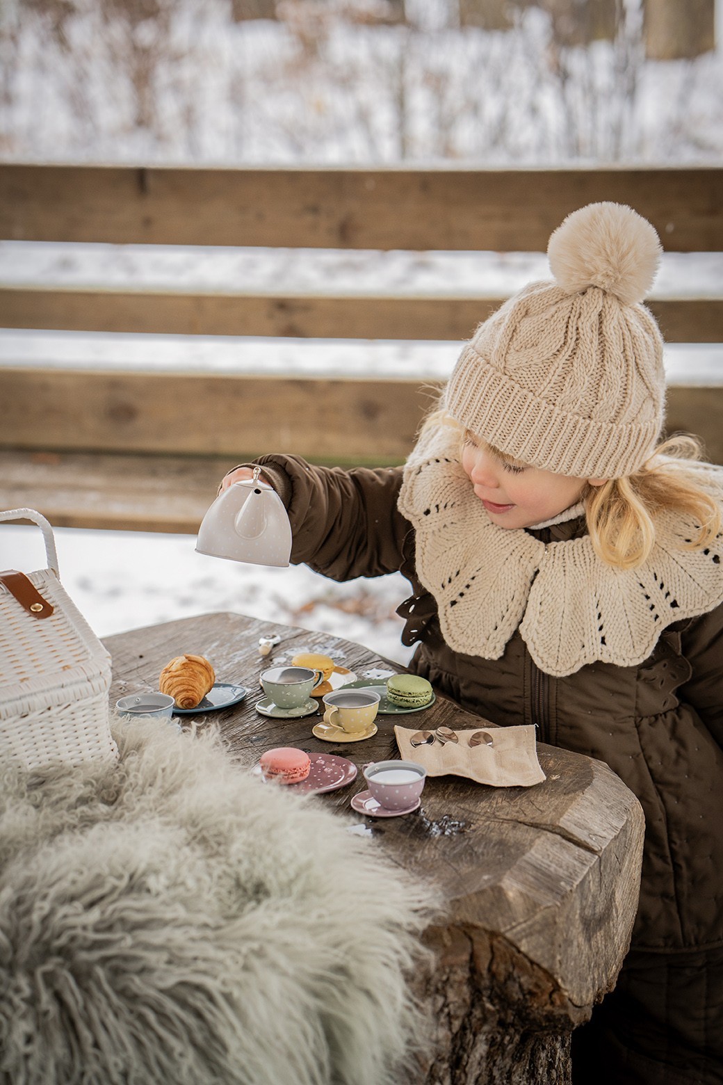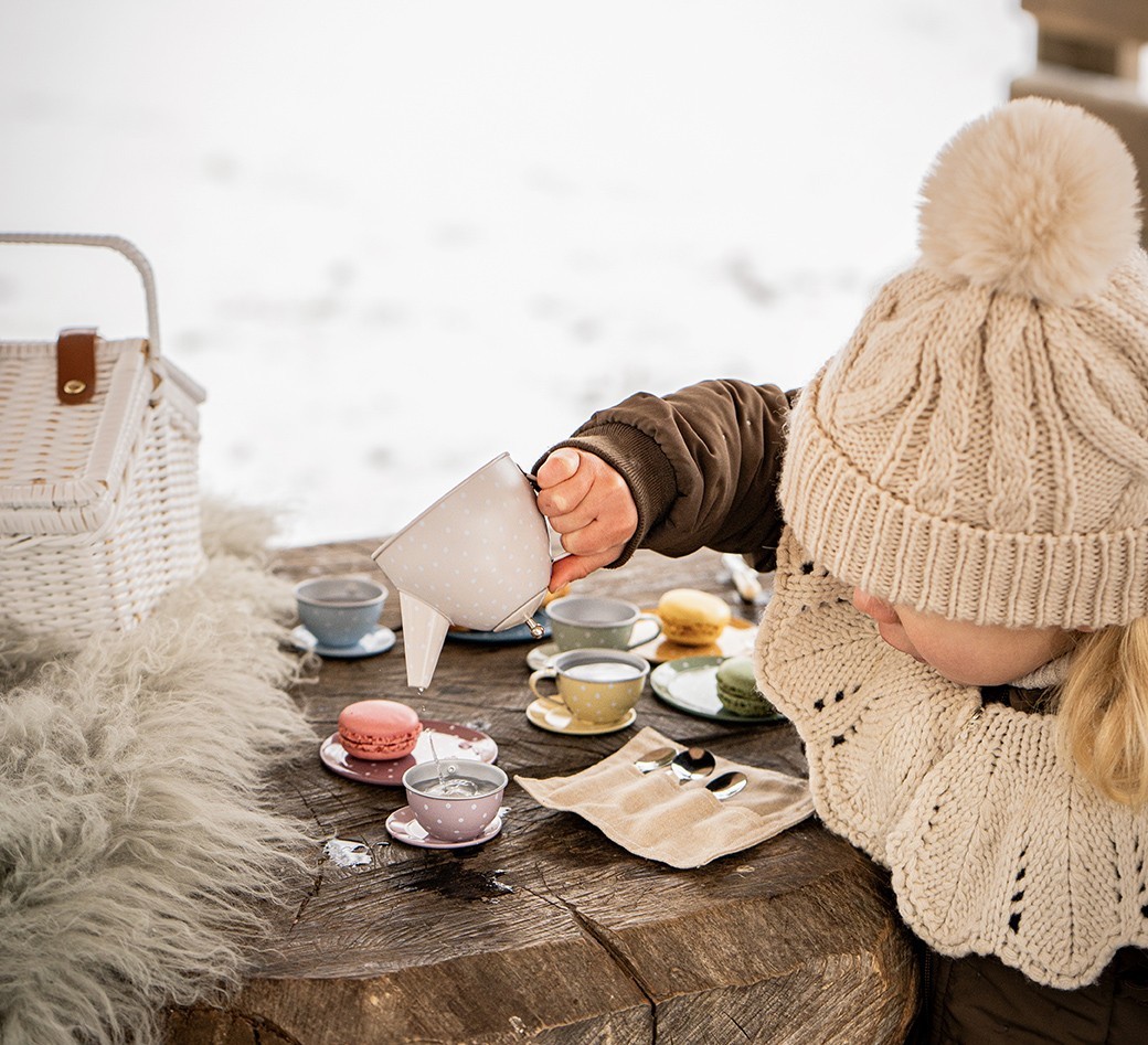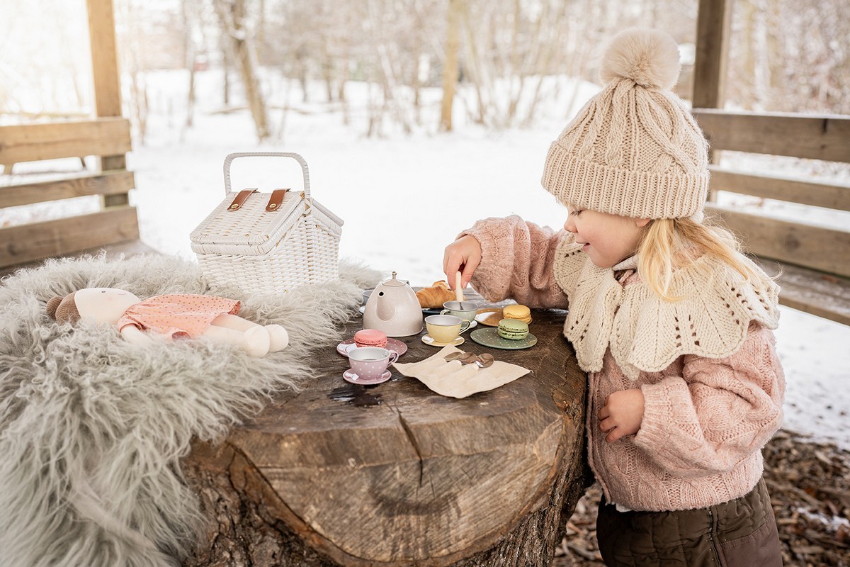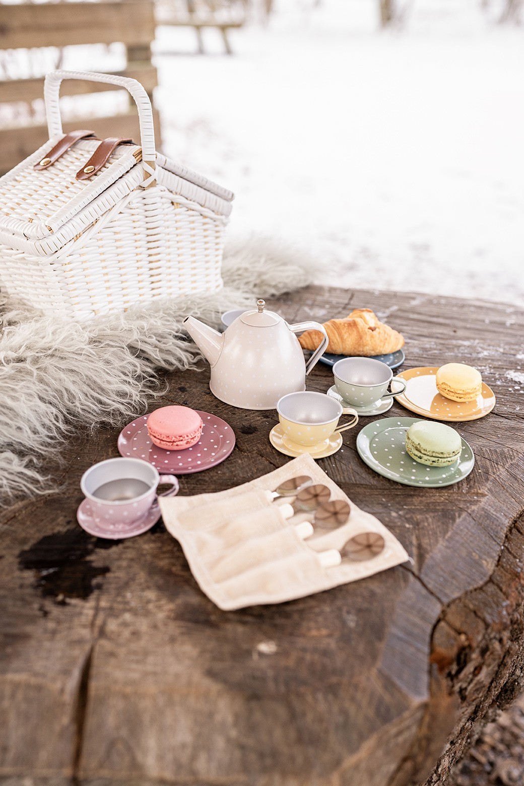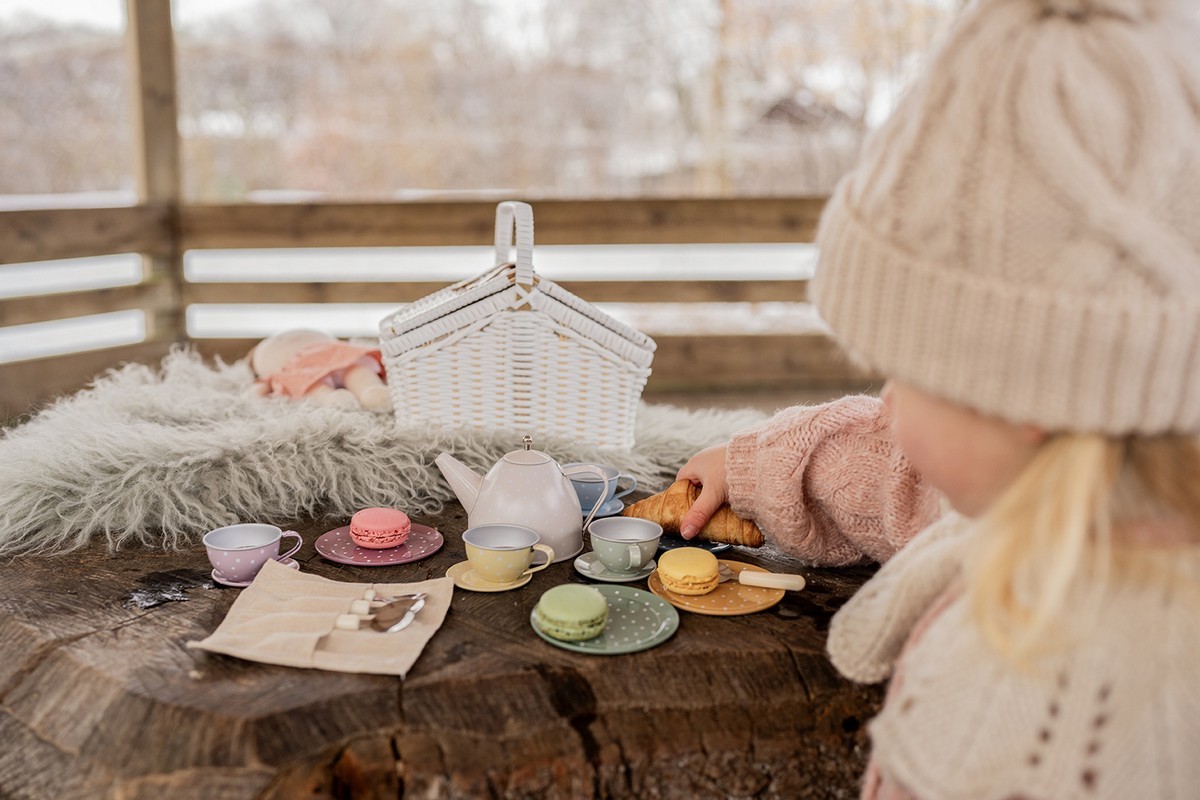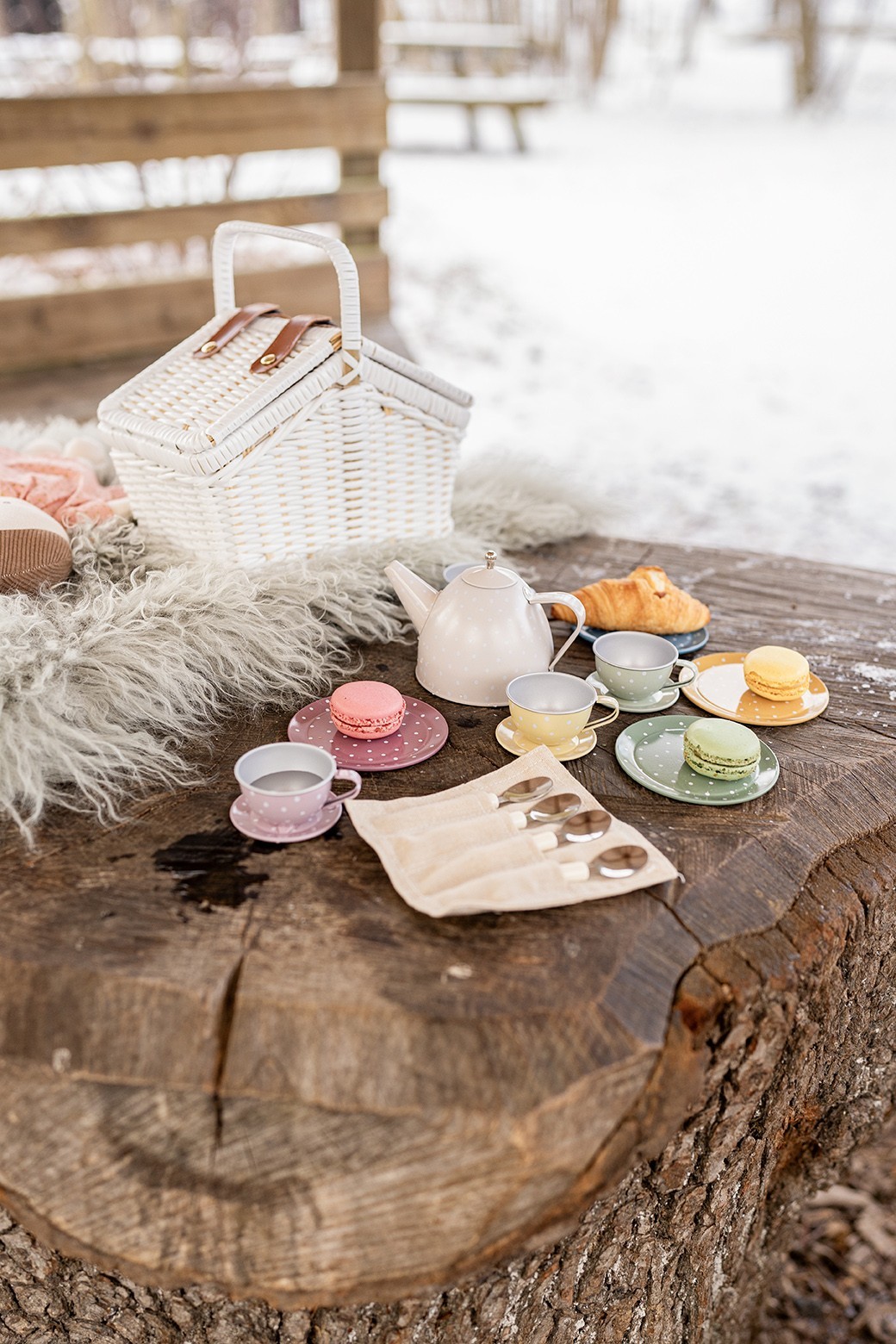 • Obsah balení: čajová konvička, 4 šálky, 4 podšálky, 4 talířky na dezerty, 4 lžičky, piknikový košík
