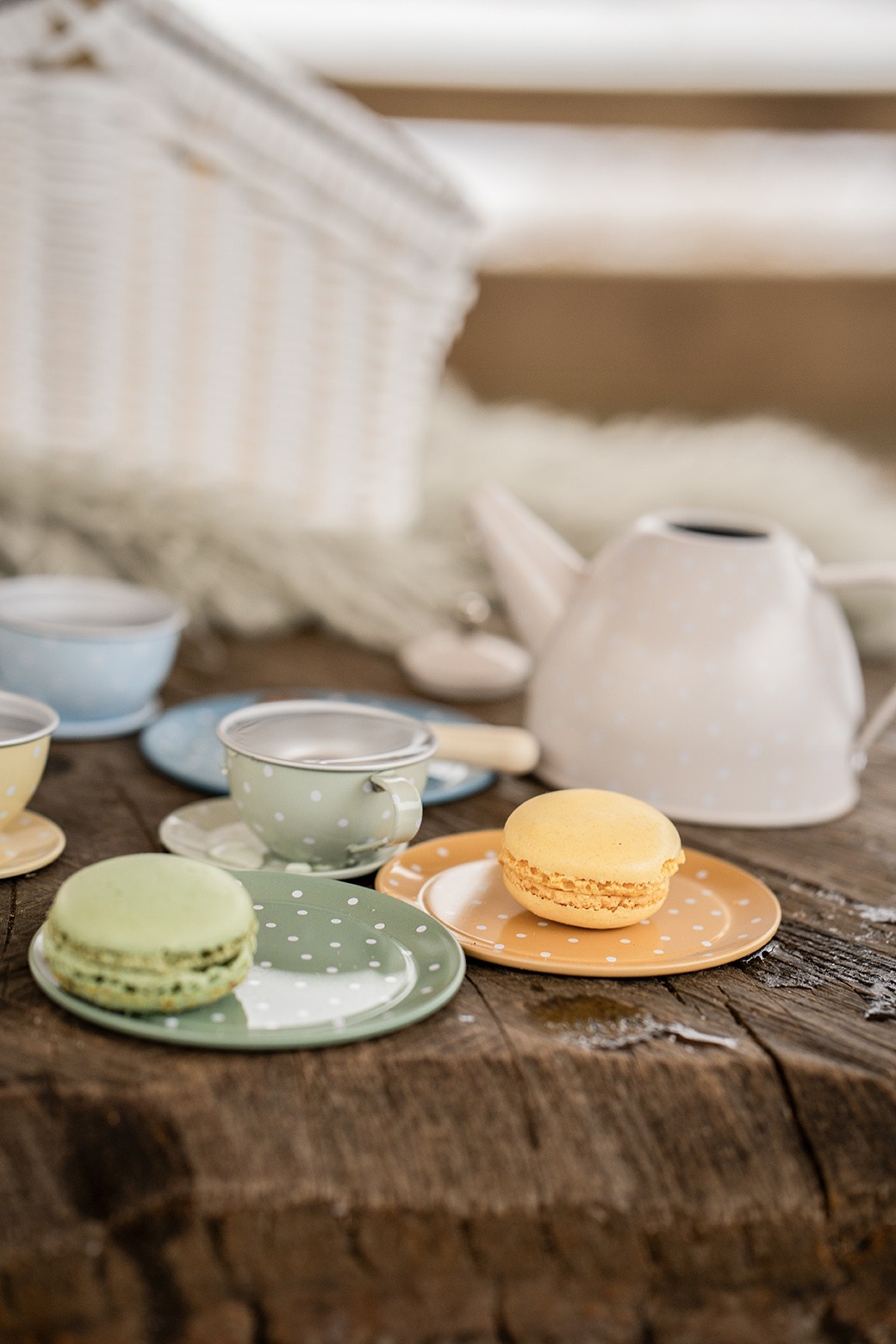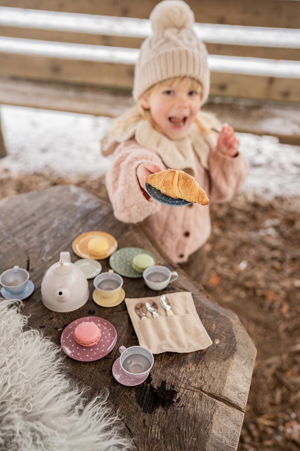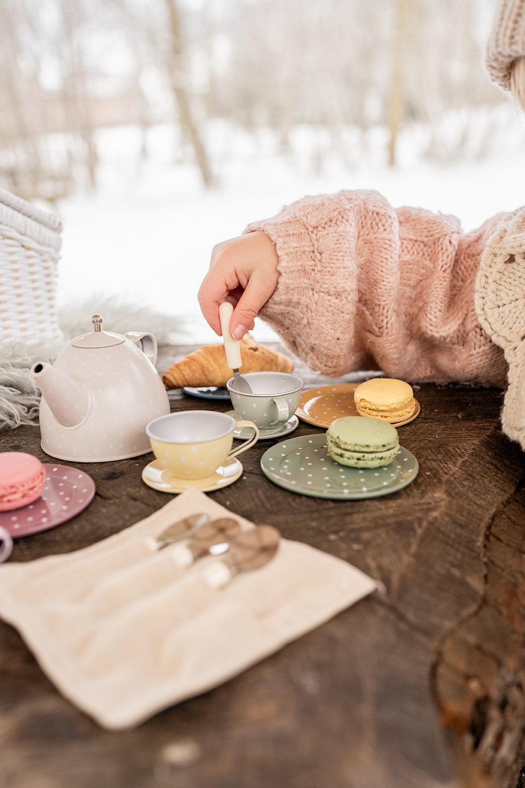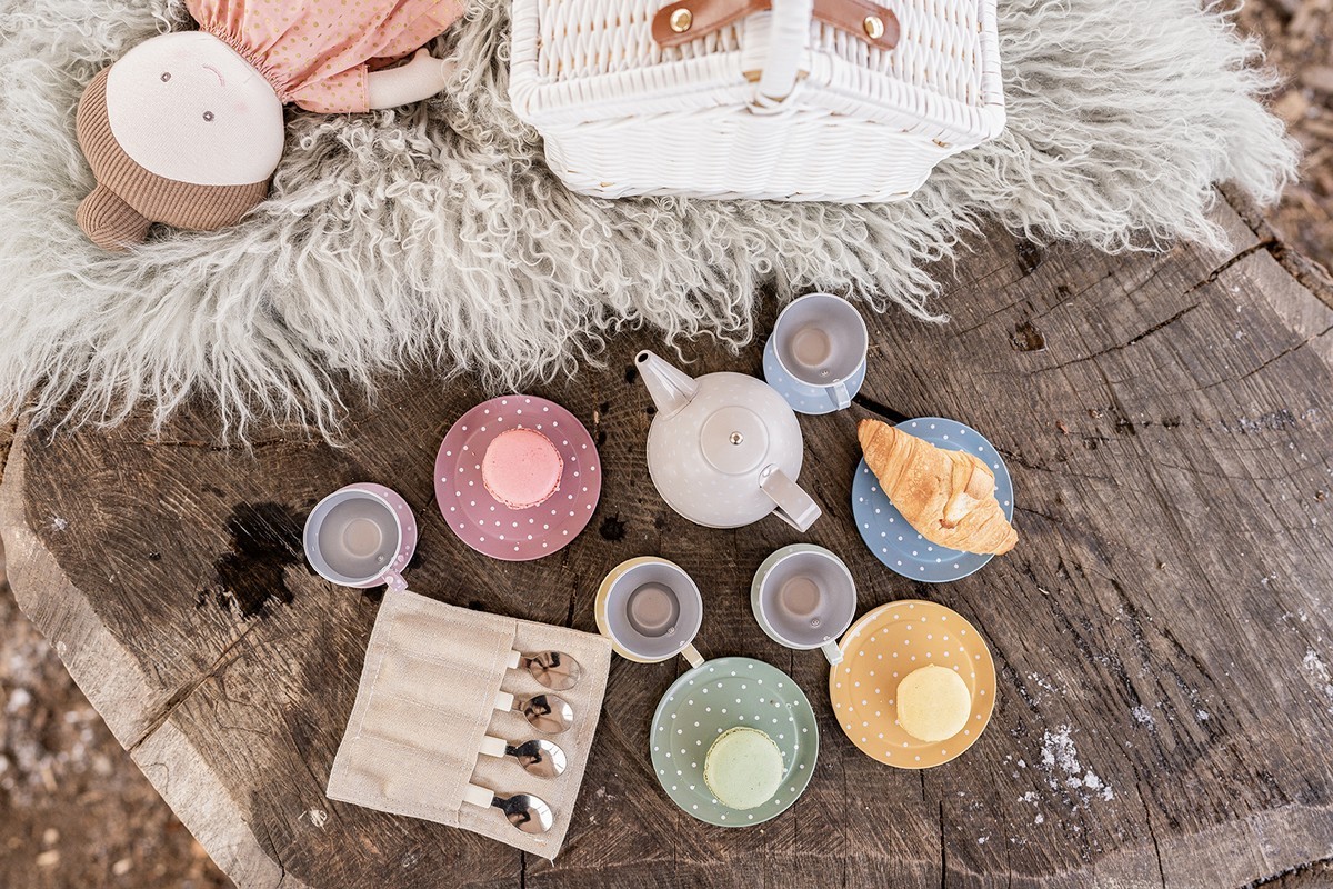 • Materiál: plech (čajový servis), nerezová ocel a PP (lžičky), košík: dřevo, bambus, bavlna, plast