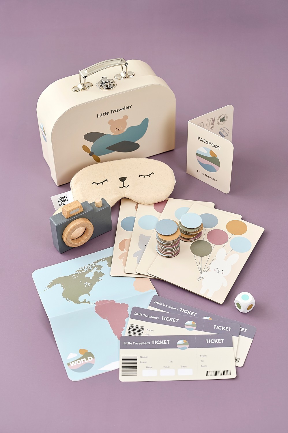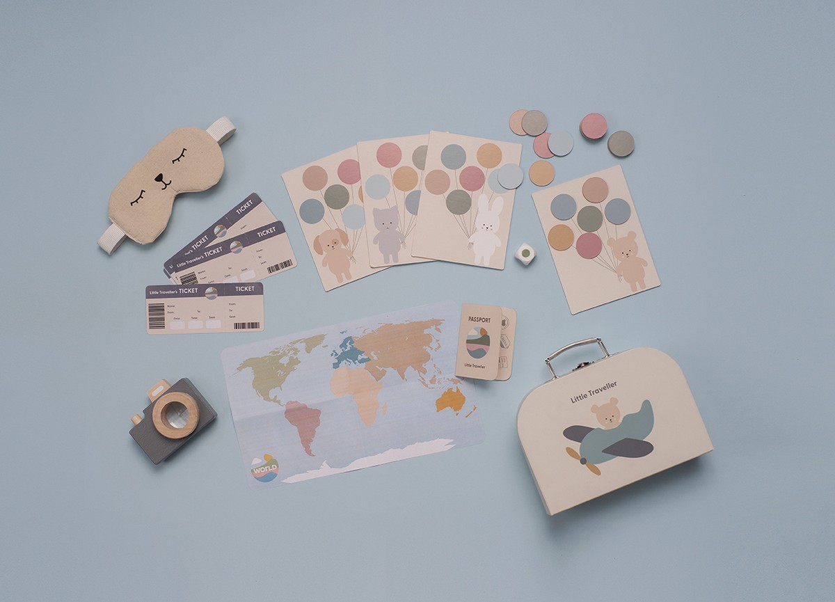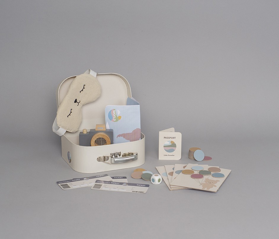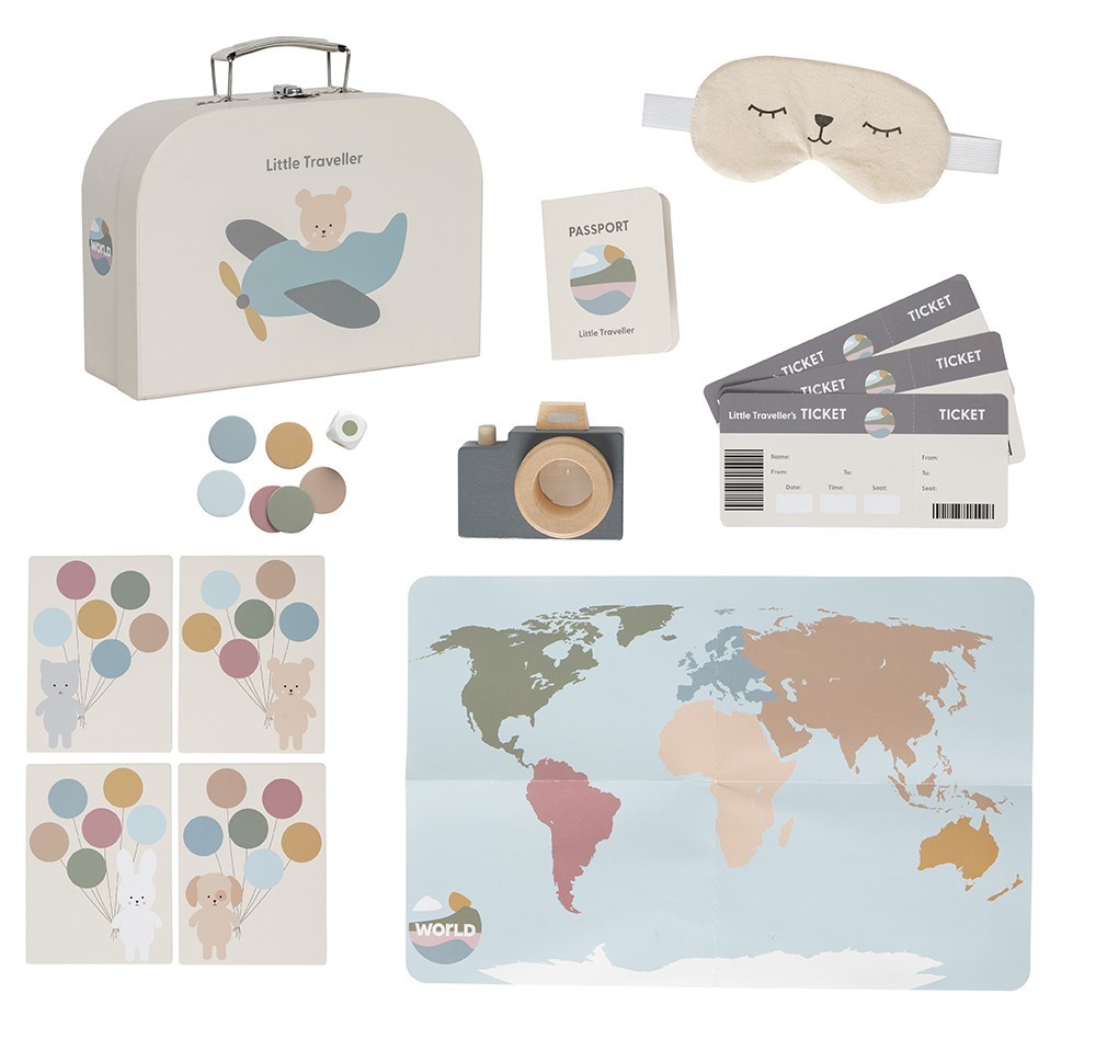 Obsah balení: cestovní taška „Malý cestovatel“, pas, 3 letenky, dřevěný fotoaparát s prizmatem, látková maska na spaní, mapa světa, cestovní hra s 4 herními políčky a 24 balónky, kostka