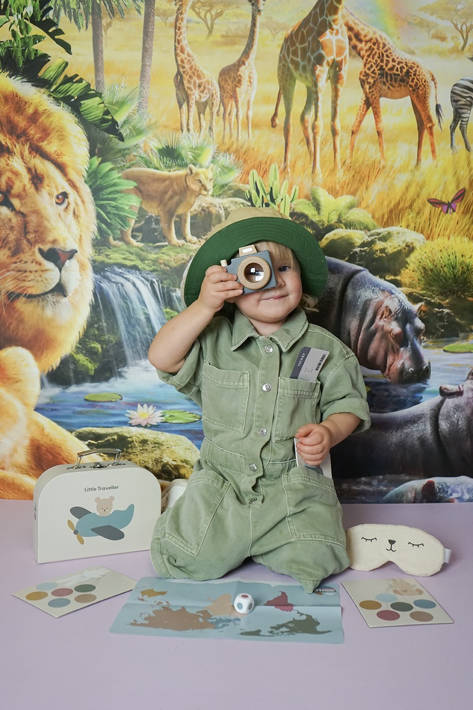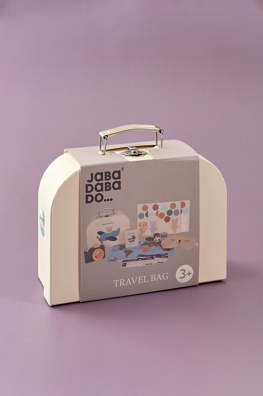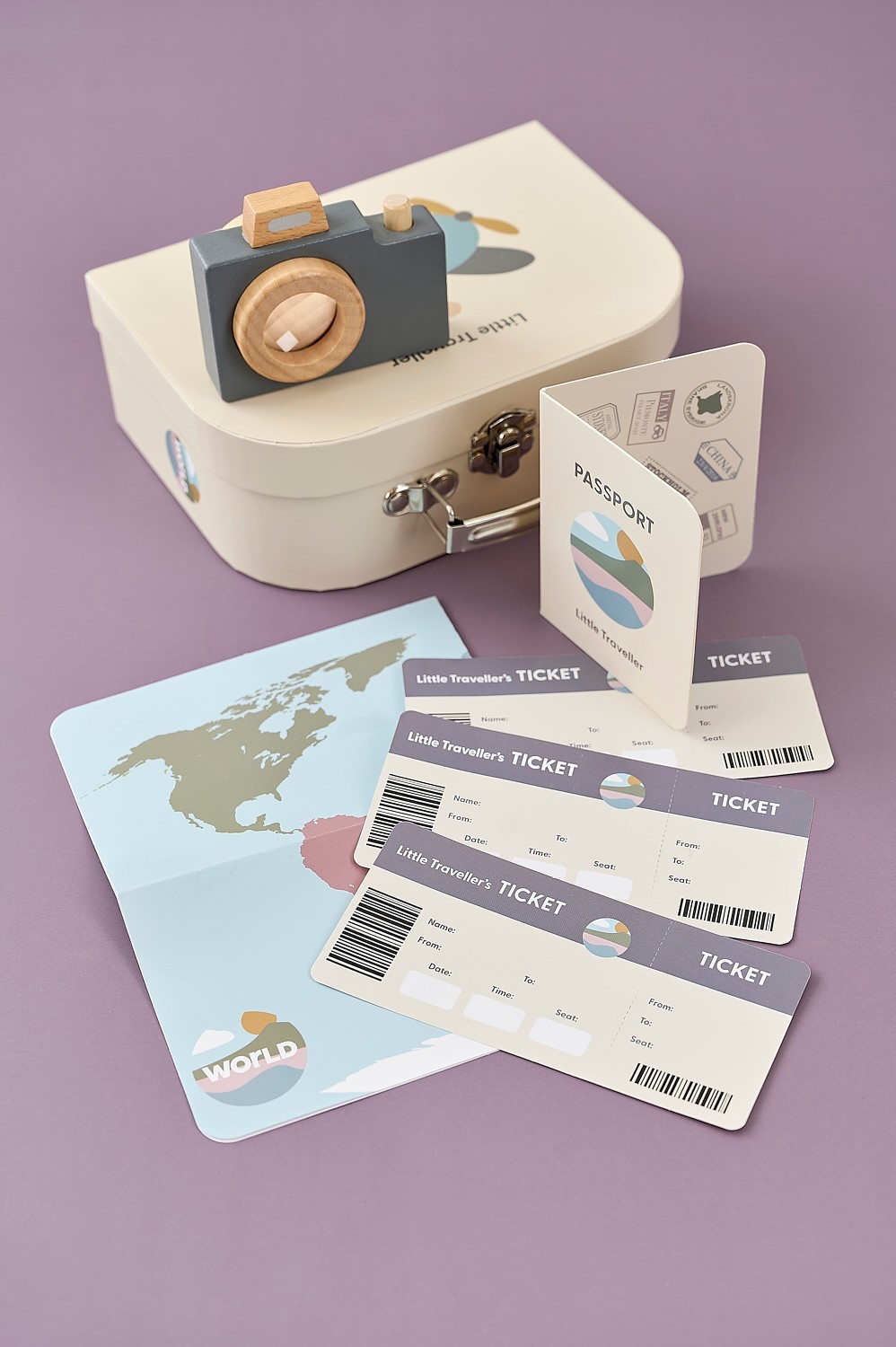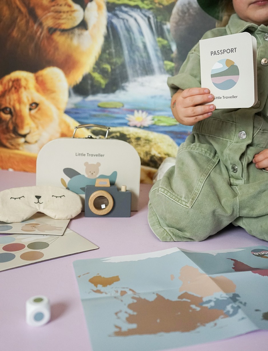 Obsah balení: cestovní taška „Malý cestovatel“, pas, 3 letenky, dřevěný fotoaparát s prizmatem, látková maska na spaní, mapa světa, cestovní hra s 4 herními políčky a 24 balónky, kostka