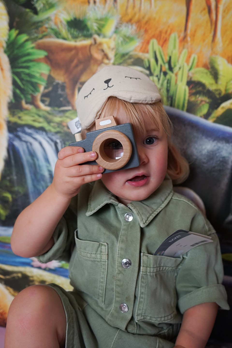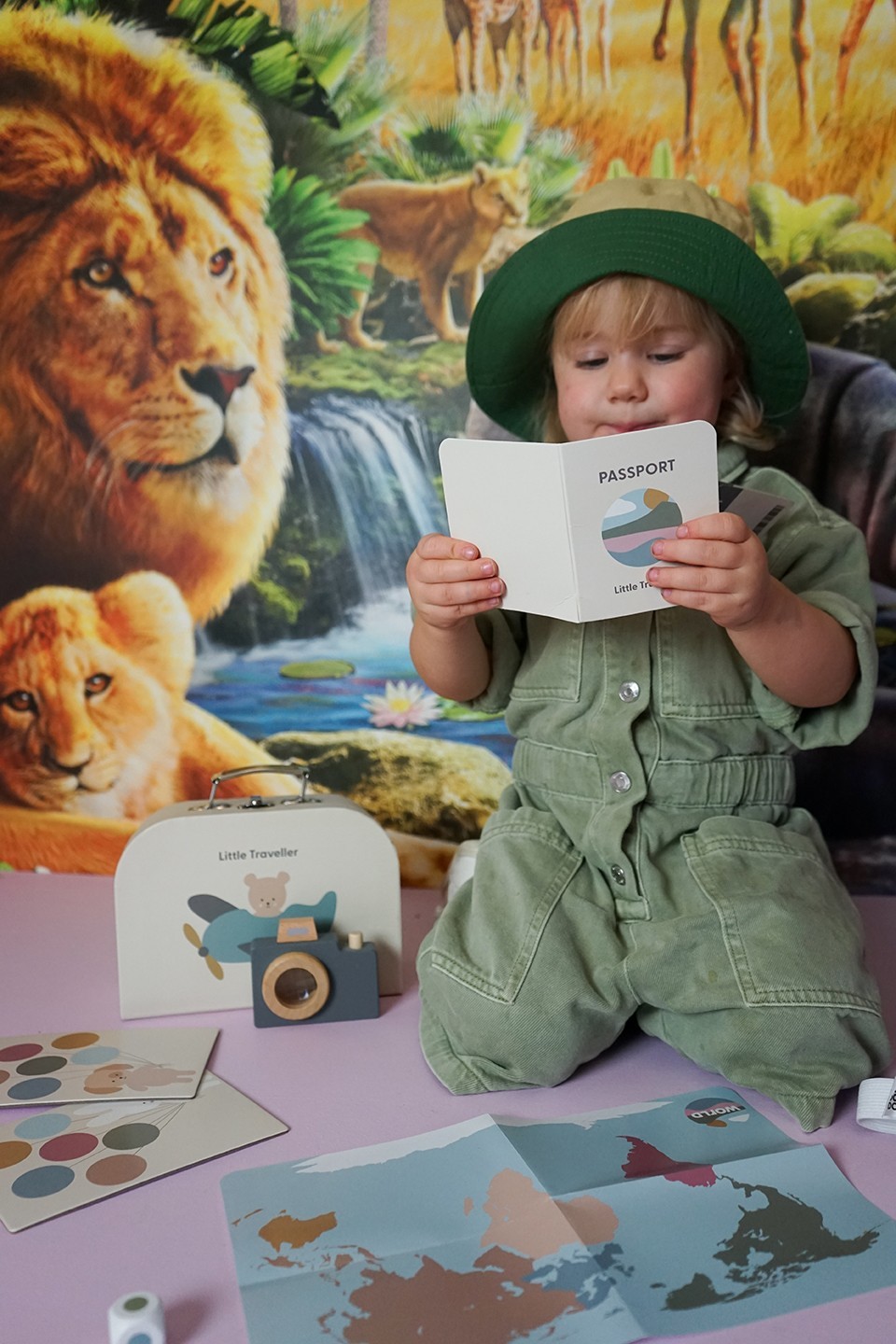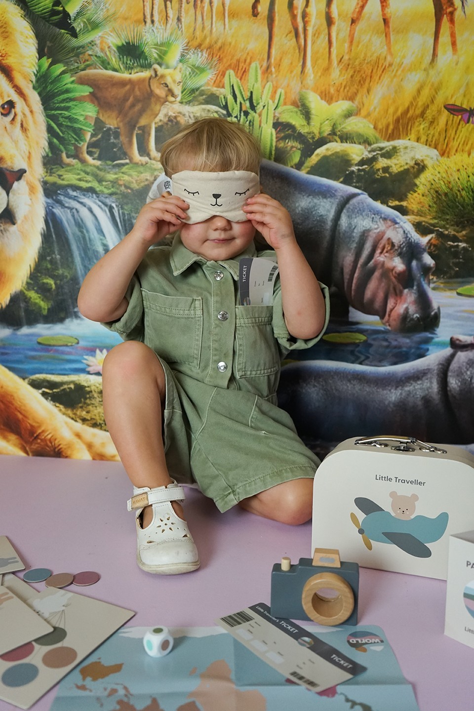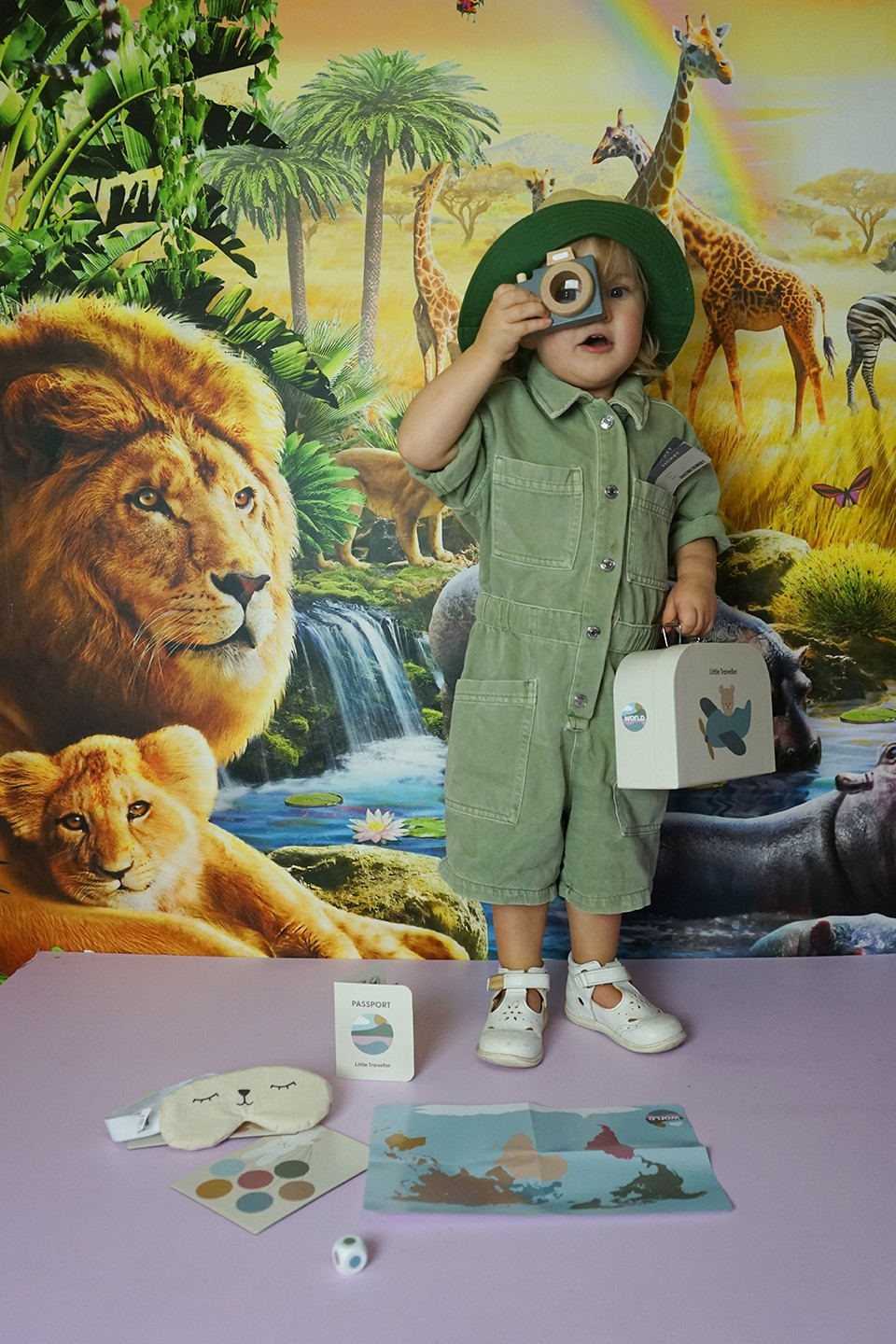 Obsah balení: cestovní taška „Malý cestovatel“, pas, 3 letenky, dřevěný fotoaparát s prizmatem, látková maska na spaní, mapa světa, cestovní hra s 4 herními políčky a 24 balónky, kostka