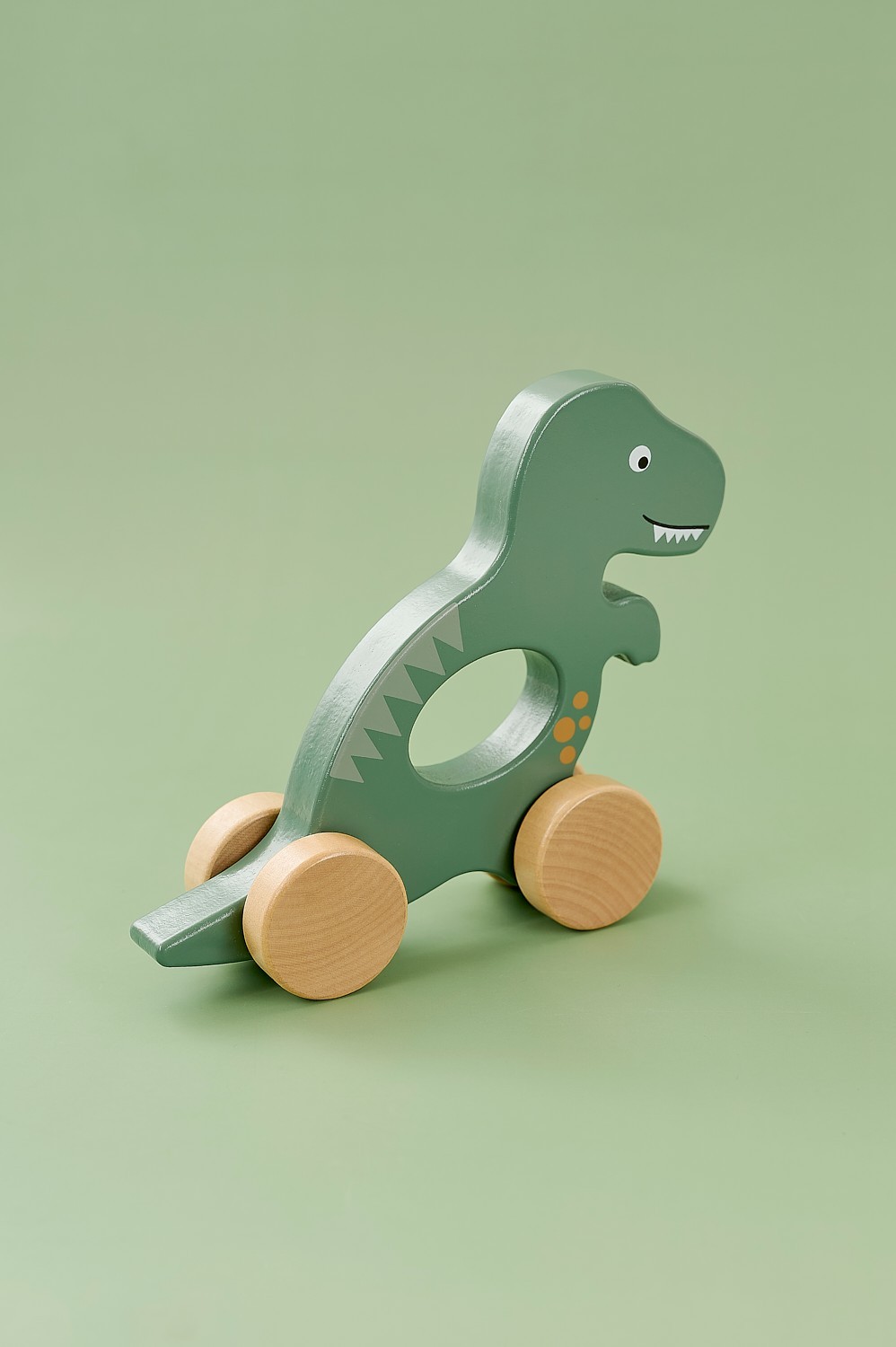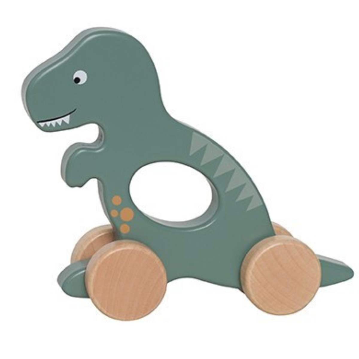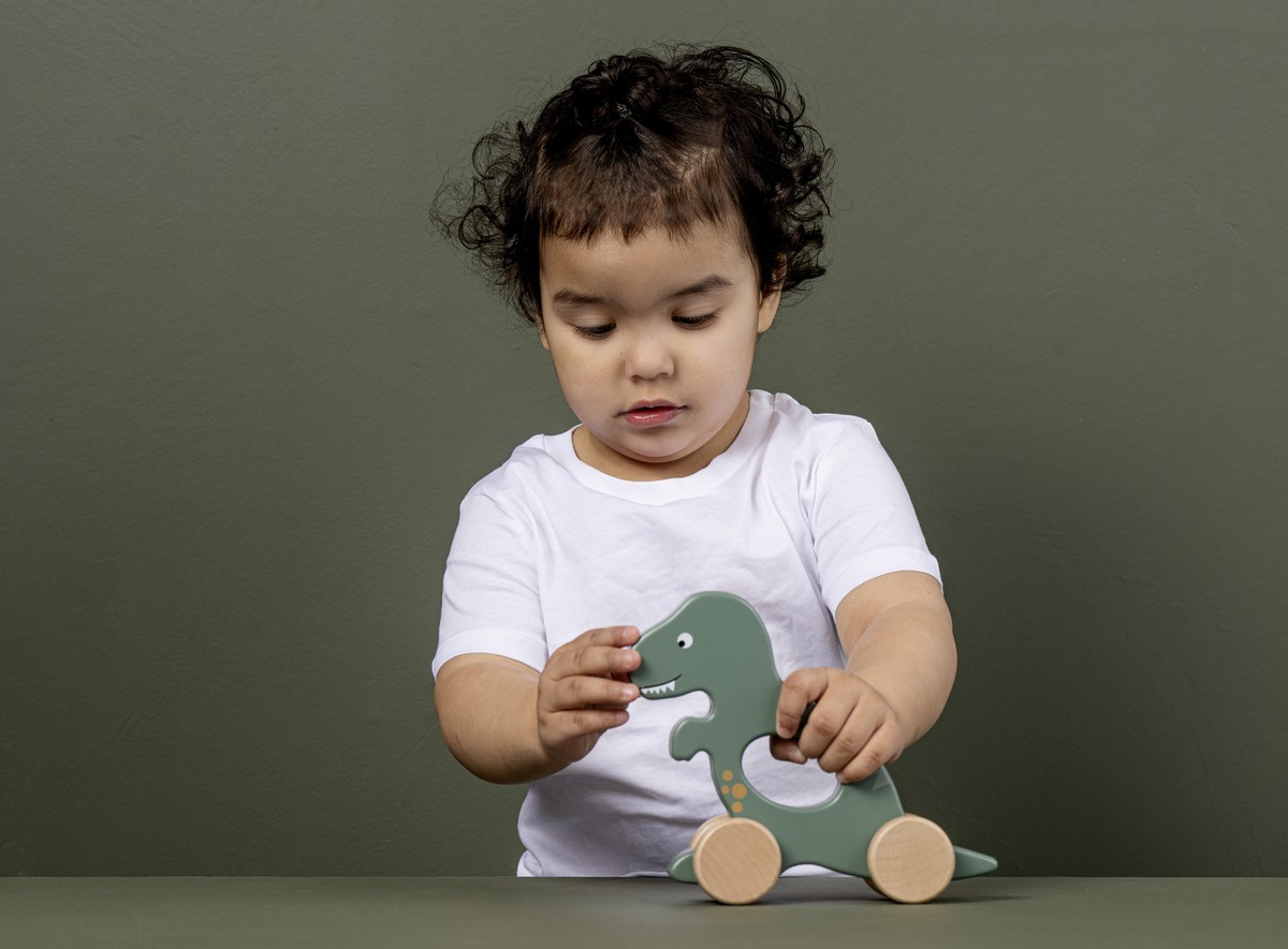 • Roztomilá dřevěná hračka ve tvaru dinosaura na kolečkách
