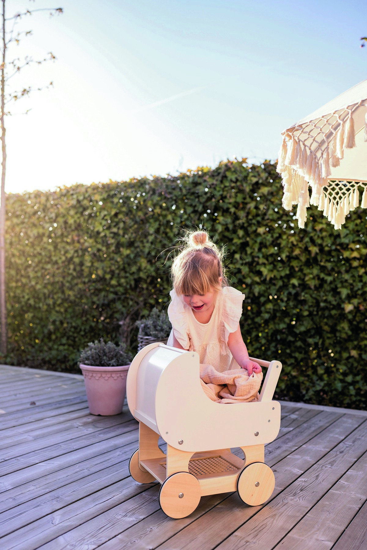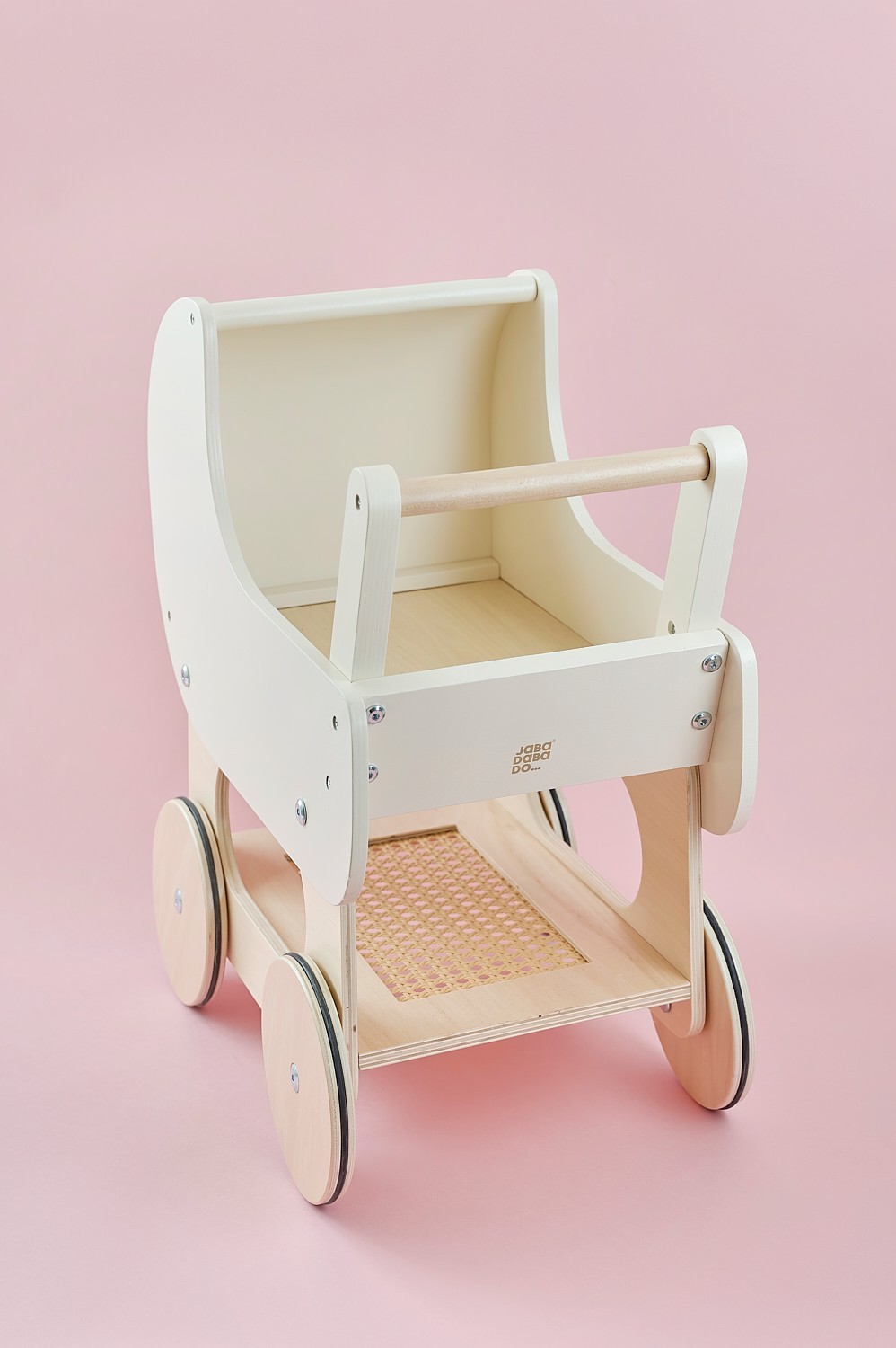 • Roztomilý dřevěný kočárek pro panenky s dekorativními detaily
