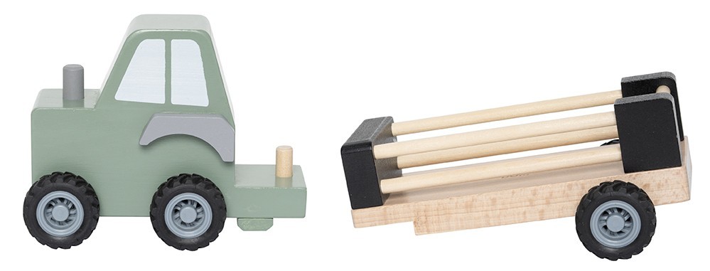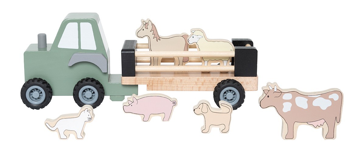 • Dřevěný traktor s odpojitelným přívěsem pro farmářská zvířátka