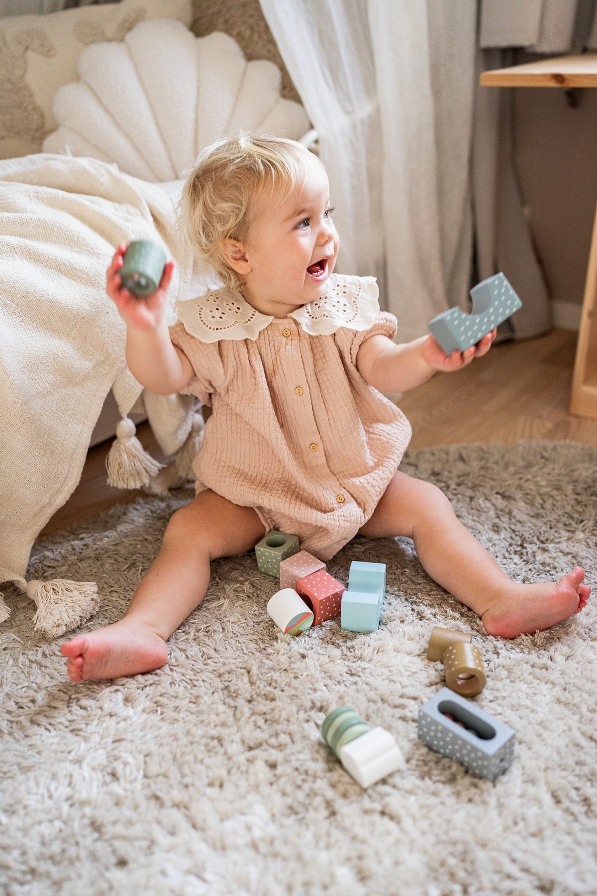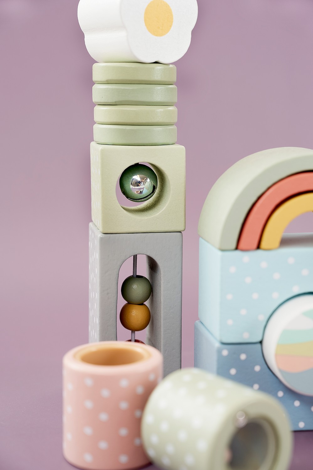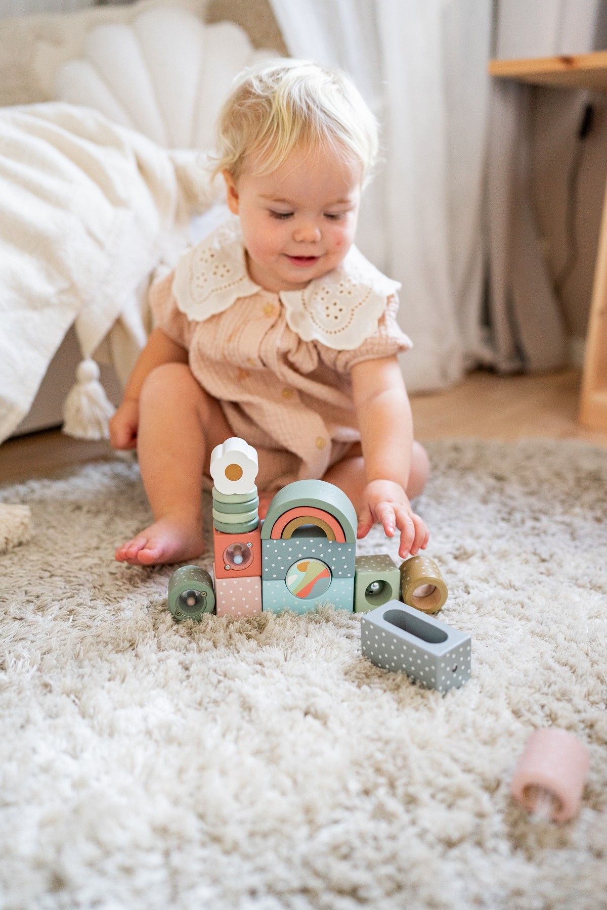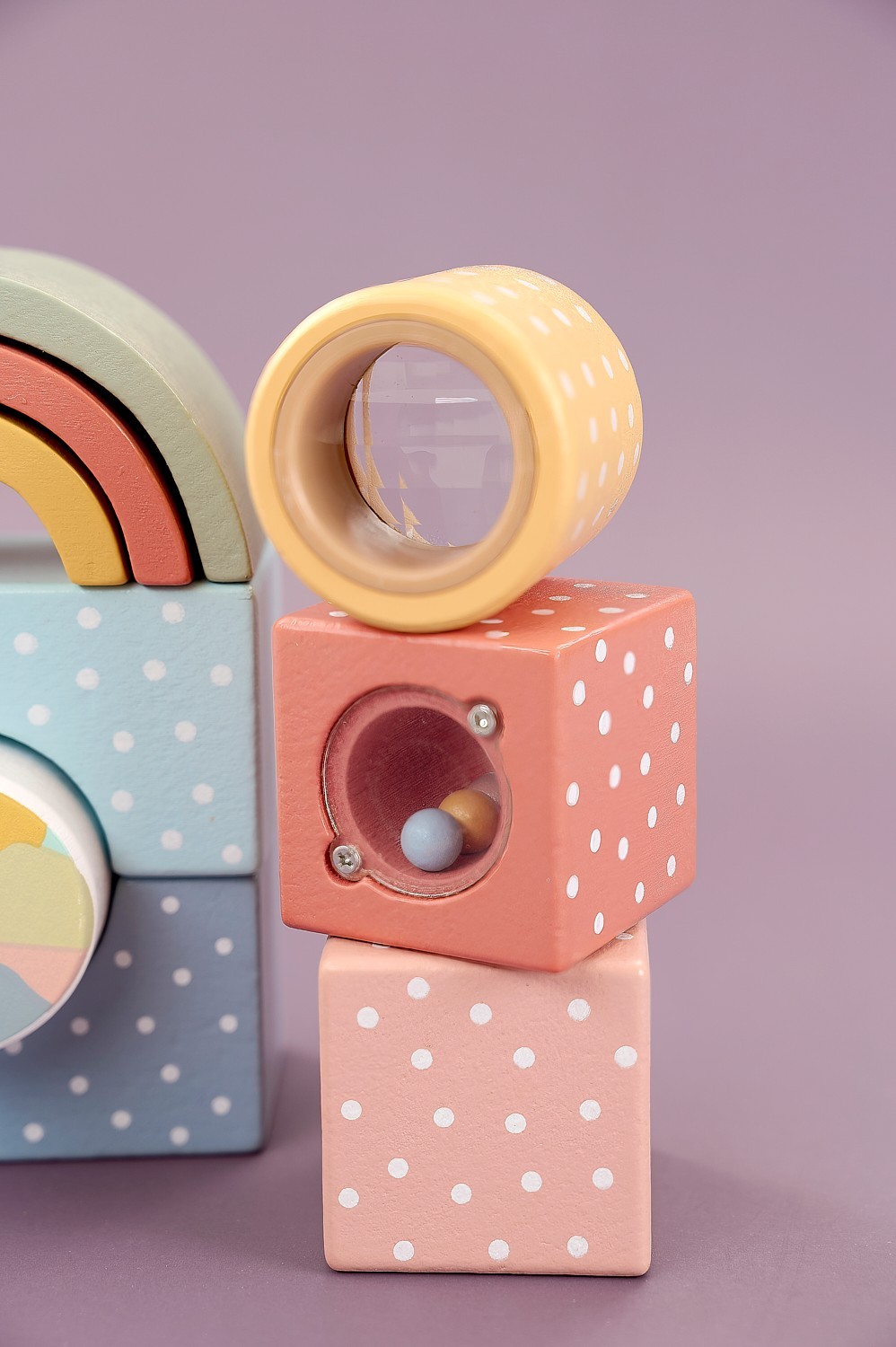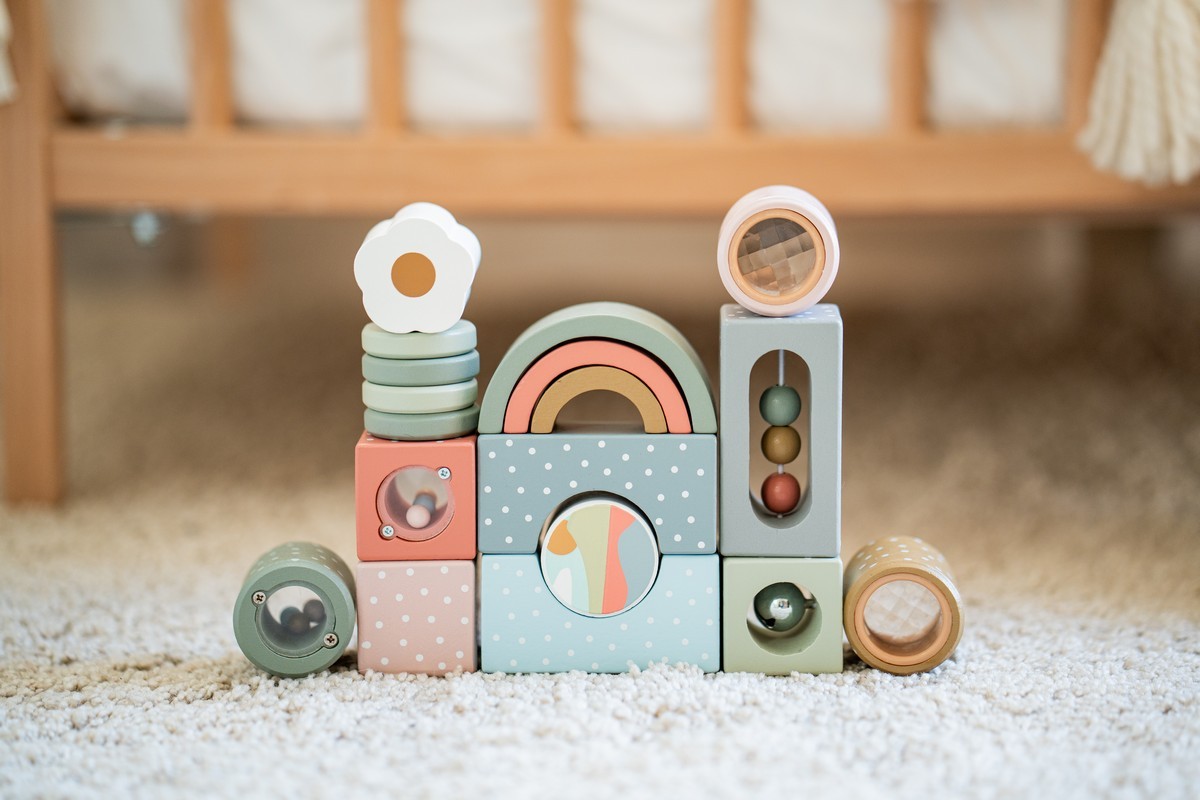 • Podporují kreativní hru – stavění věží, objevování zvuků a experimentování s tvary
