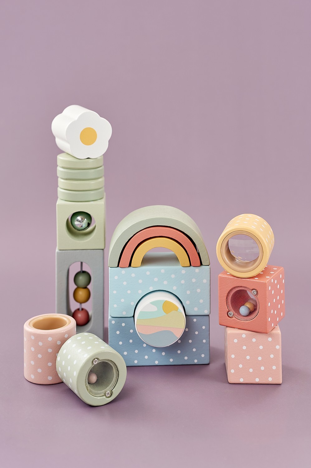 • Zvukové kostky s různými efekty – některé chrastí, jiné zvoní, všechny mají jemné barvy a vzory