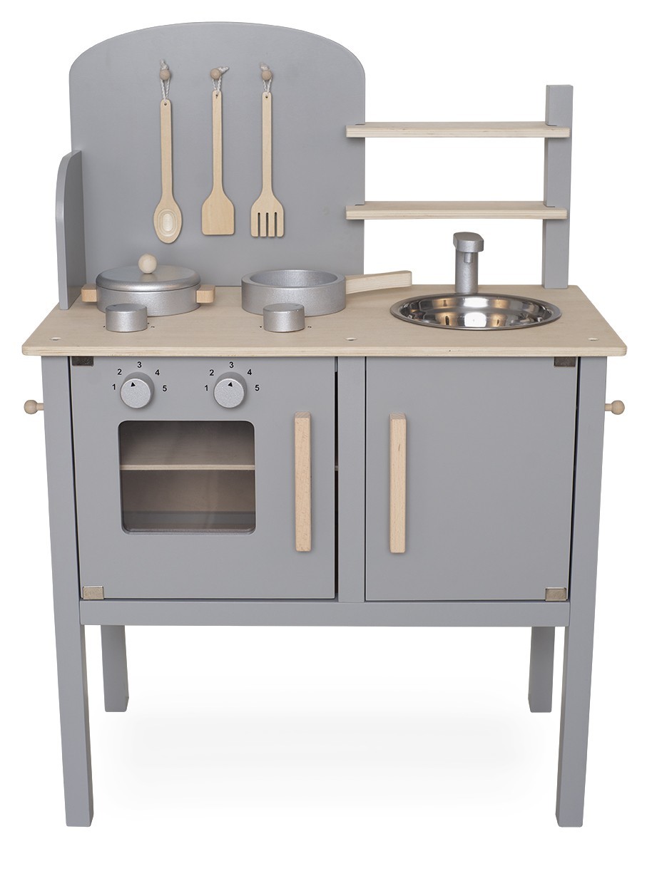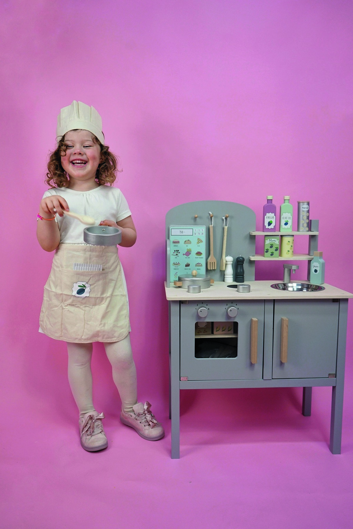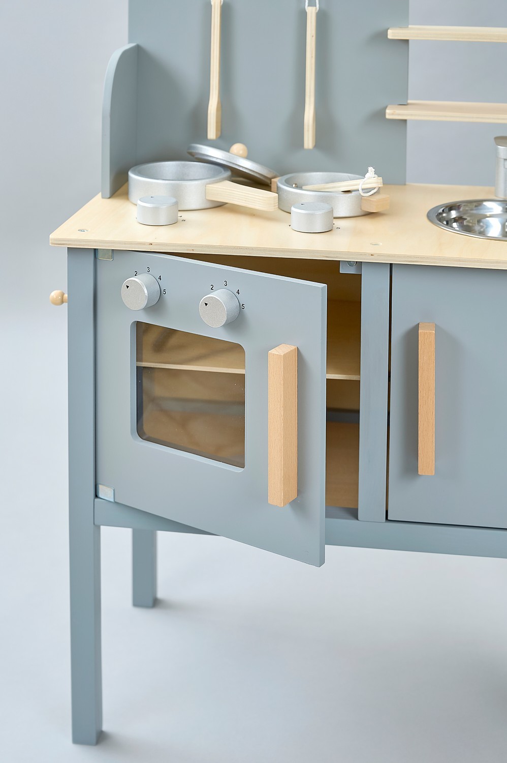 • Obsahuje spoustu hravých detailů: dřez, sporák, troubu, stejně jako hrnec, pánev a tři kuchyňské nástroje