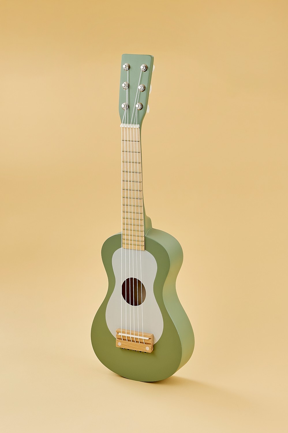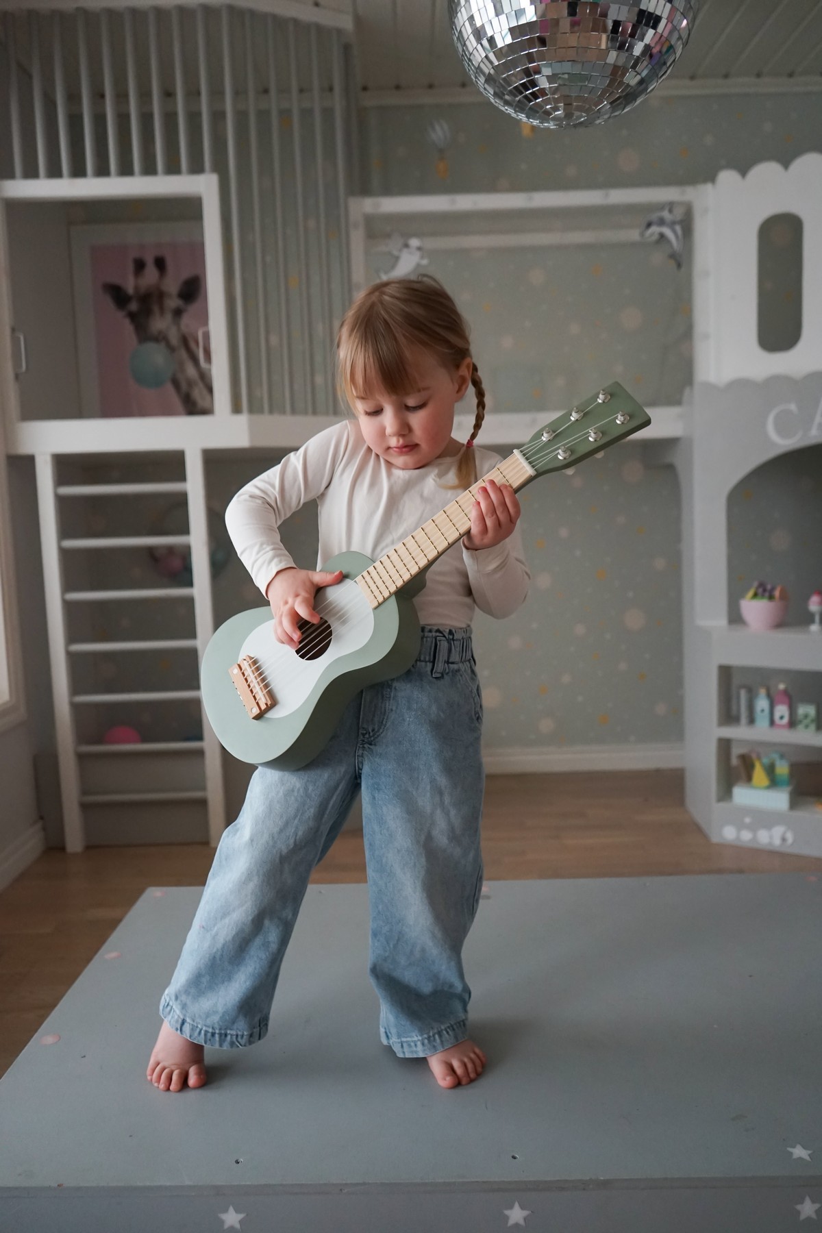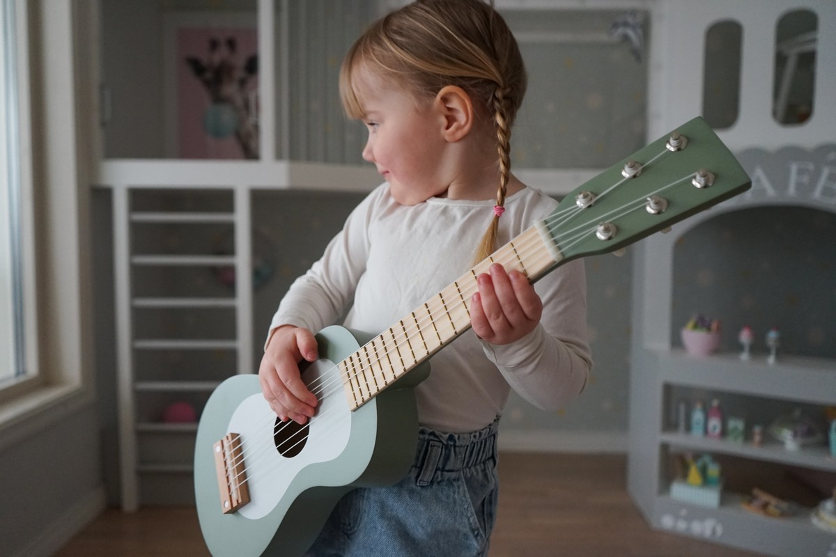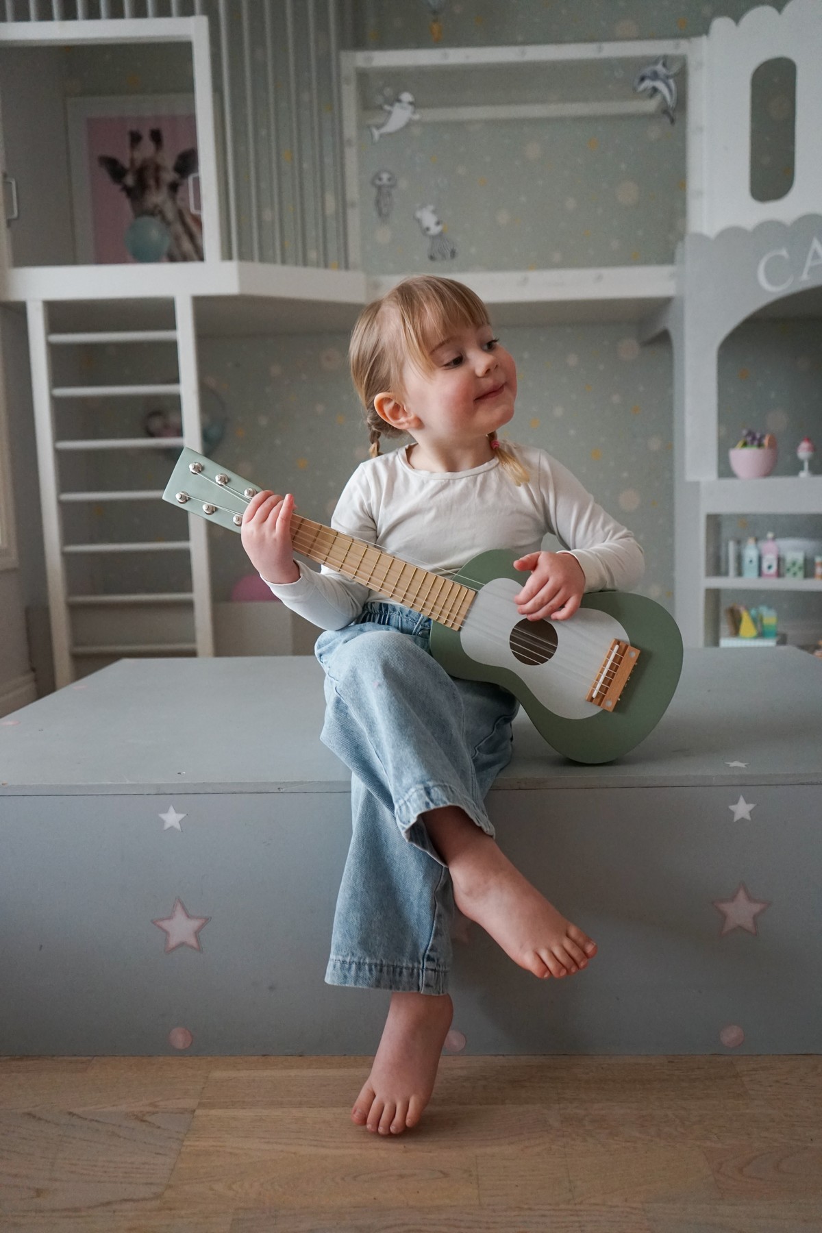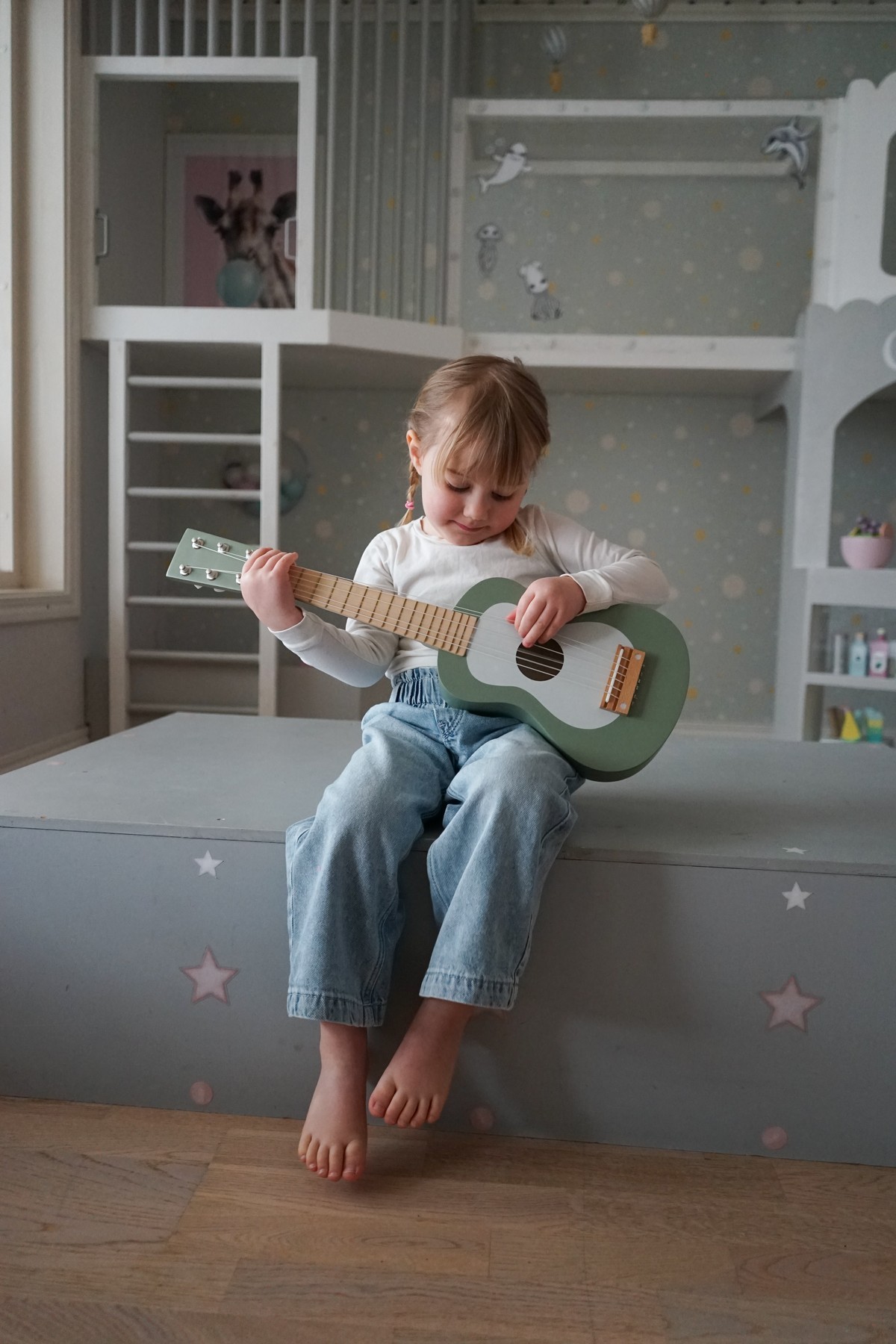 • Dřevěná kytara se 6 strunami pro první hudební pokusy dětí