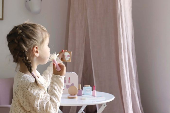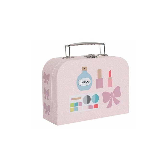 Roztomilý kufřík obsahující dřevěné produkty pro kreativní hru – parfém, rtěnku, paletu se stíny, aplikátor na oční stíny, lak na nehty, tvářenku, zrcadlo a lesk na rty