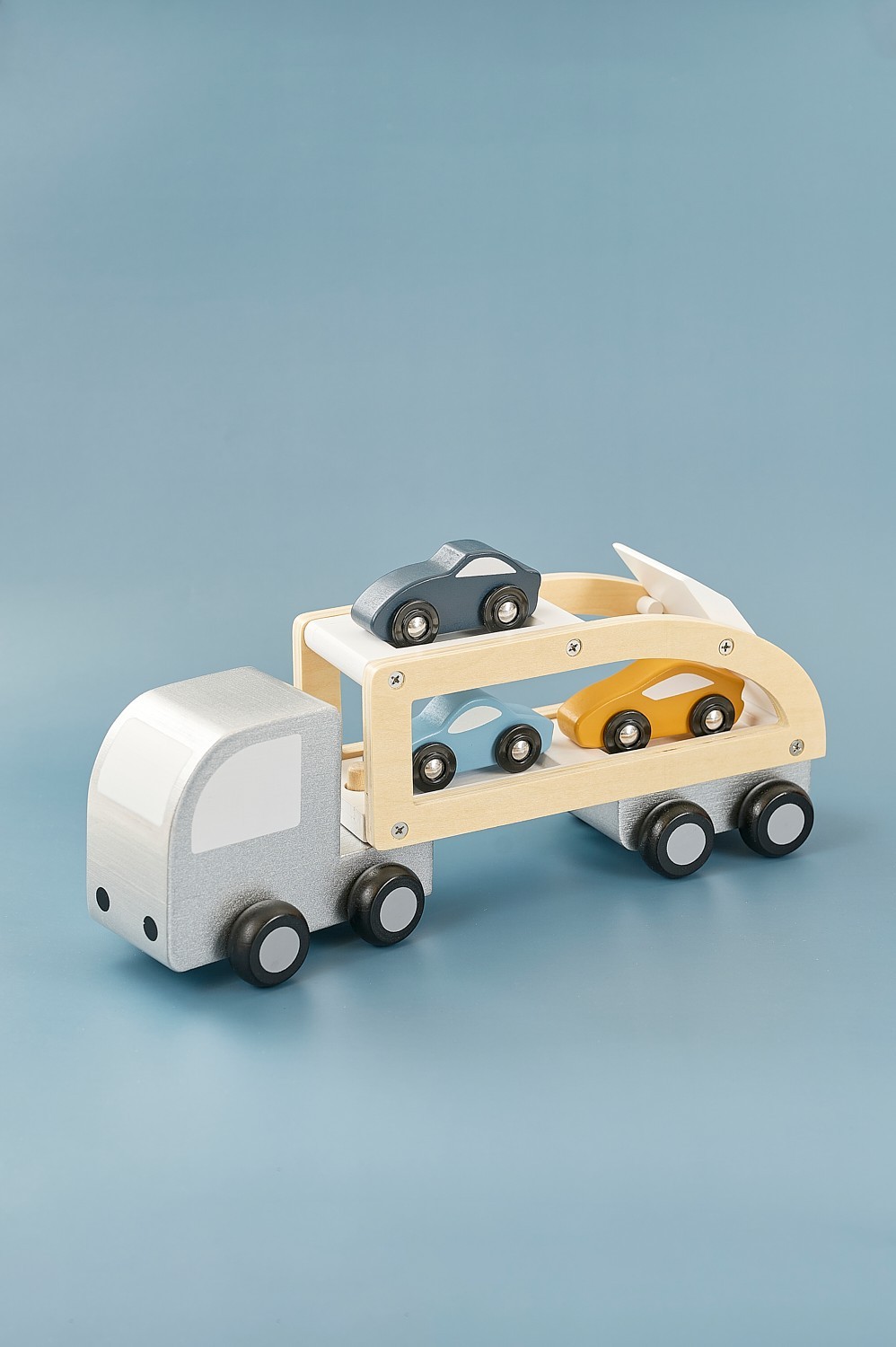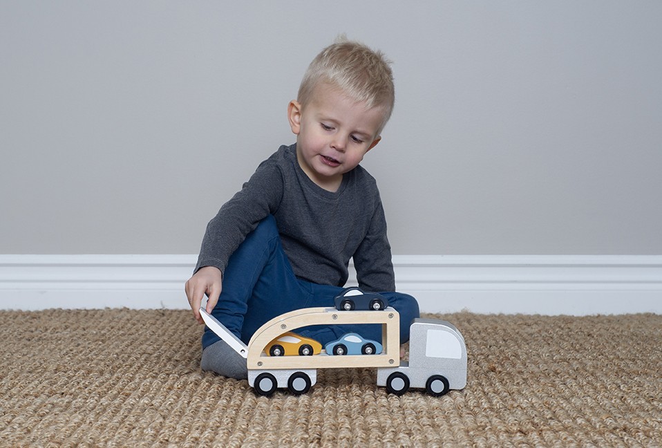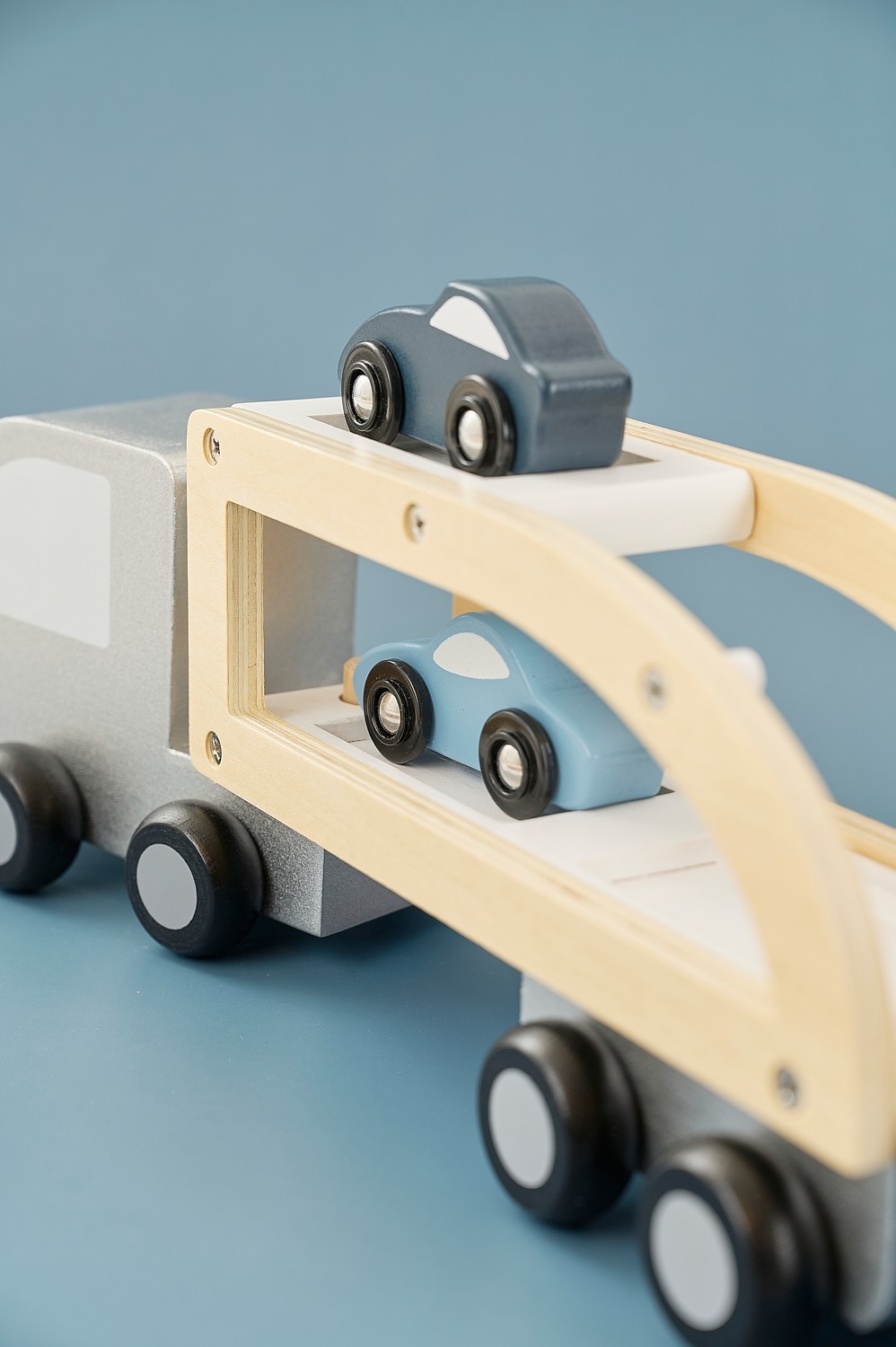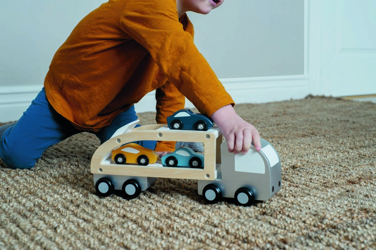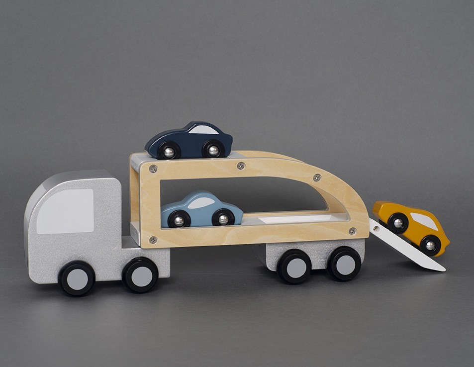 • Přívěs má dvě patra pro naložení tří dřevěných autíček a snadný transport do „garáže“