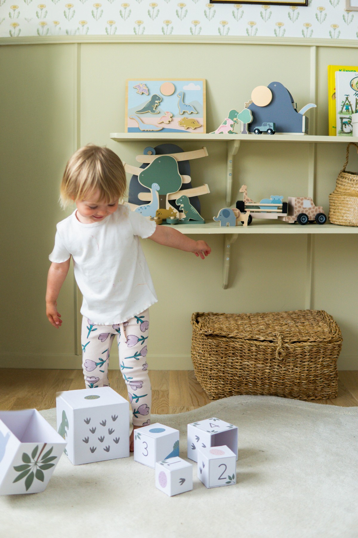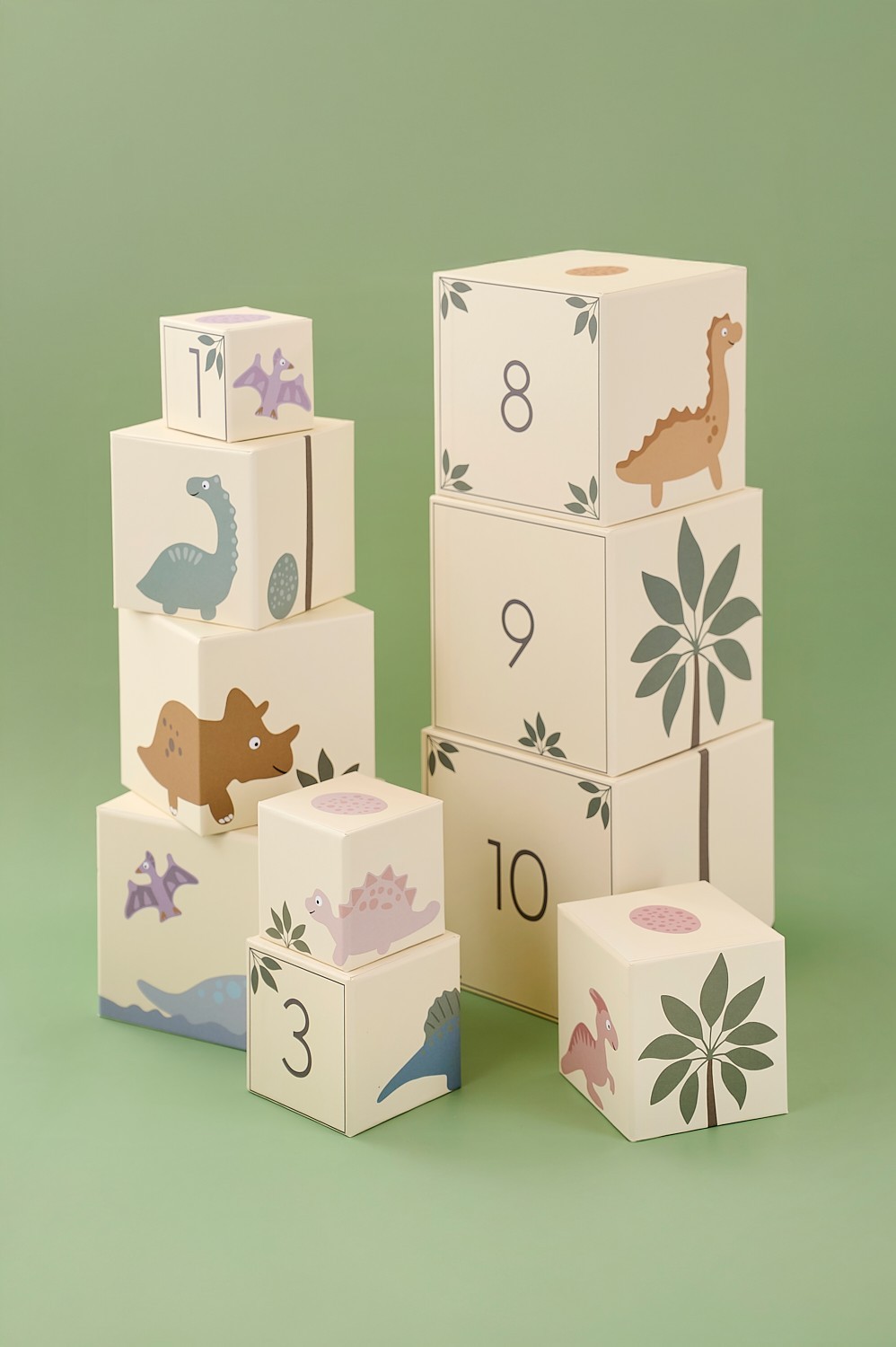 • Každá strana kostek obsahuje čísla, stopy dinosaurů a hravé ilustrace
