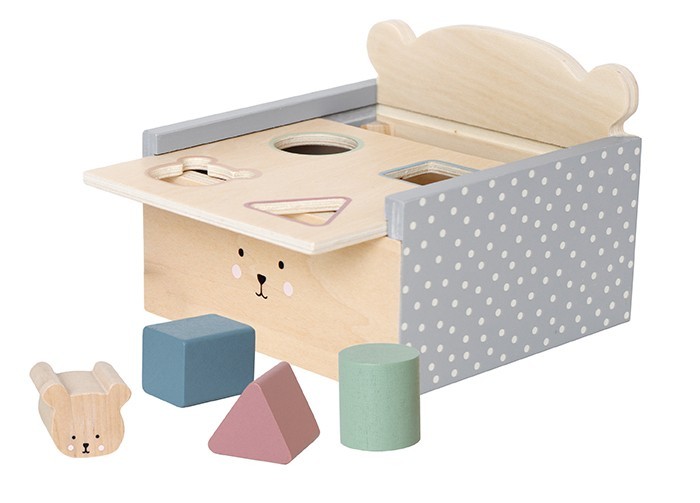 • Obsahuje odnímatelný kryt a čtyři tvary: trojúhelník, medvídek, kostku a válec v různých barvách