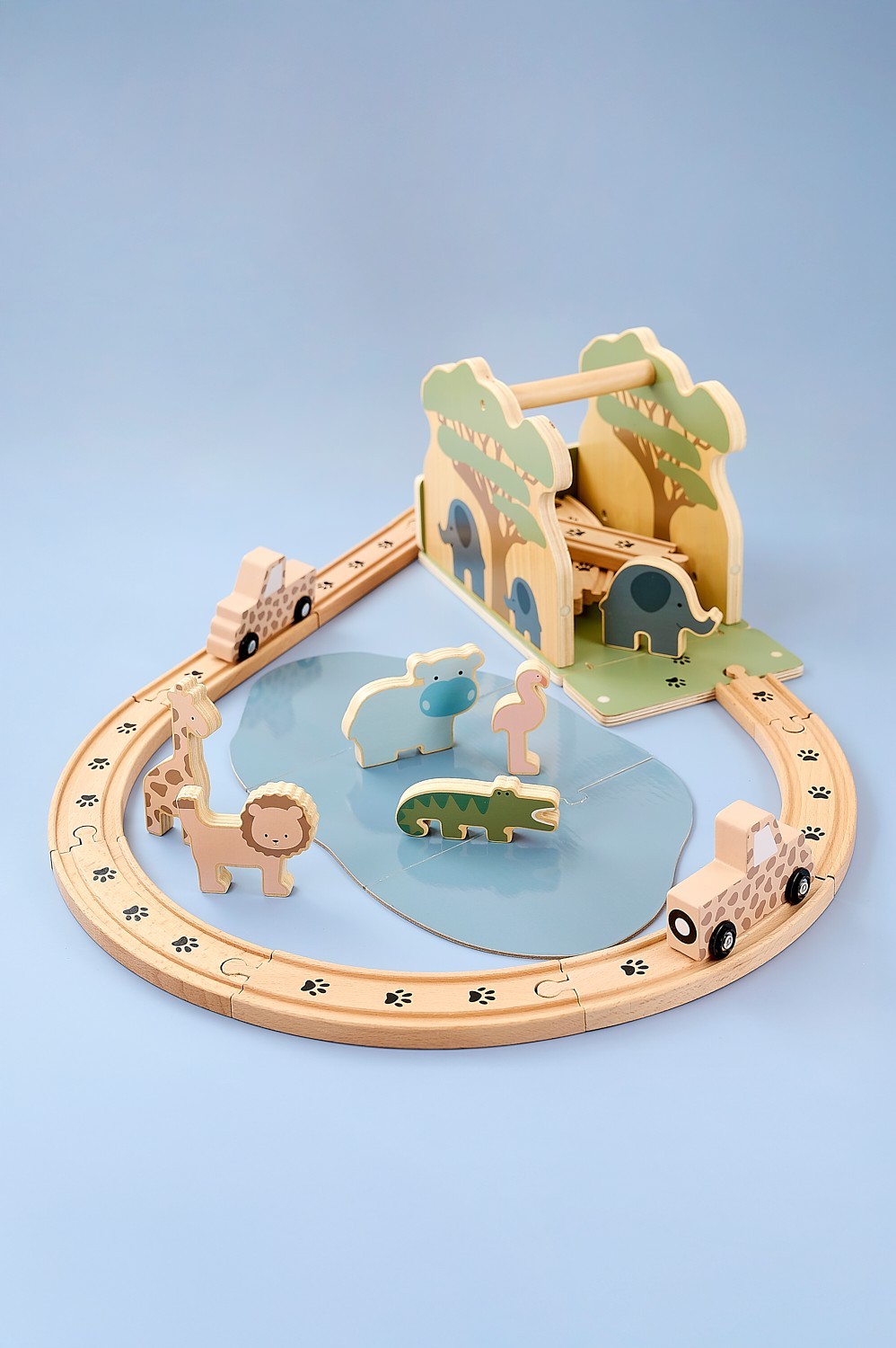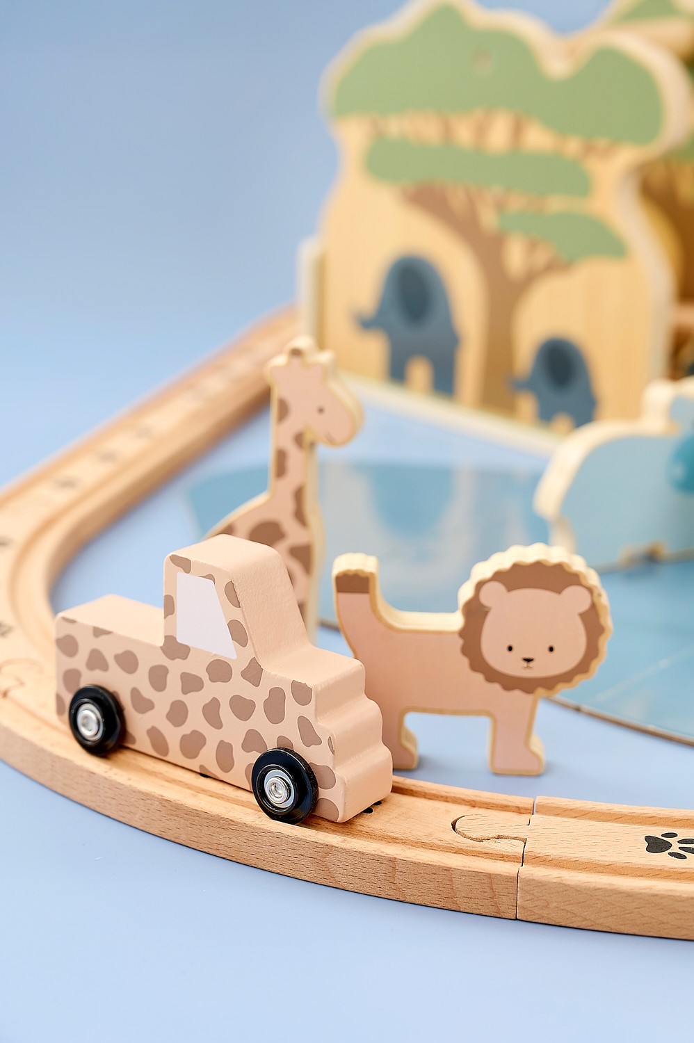 • Dřevěná dráha s vláčkem, zvířátky a přírodními dekoracemi podporuje kreativní hru, vyprávění příběhů a představivost