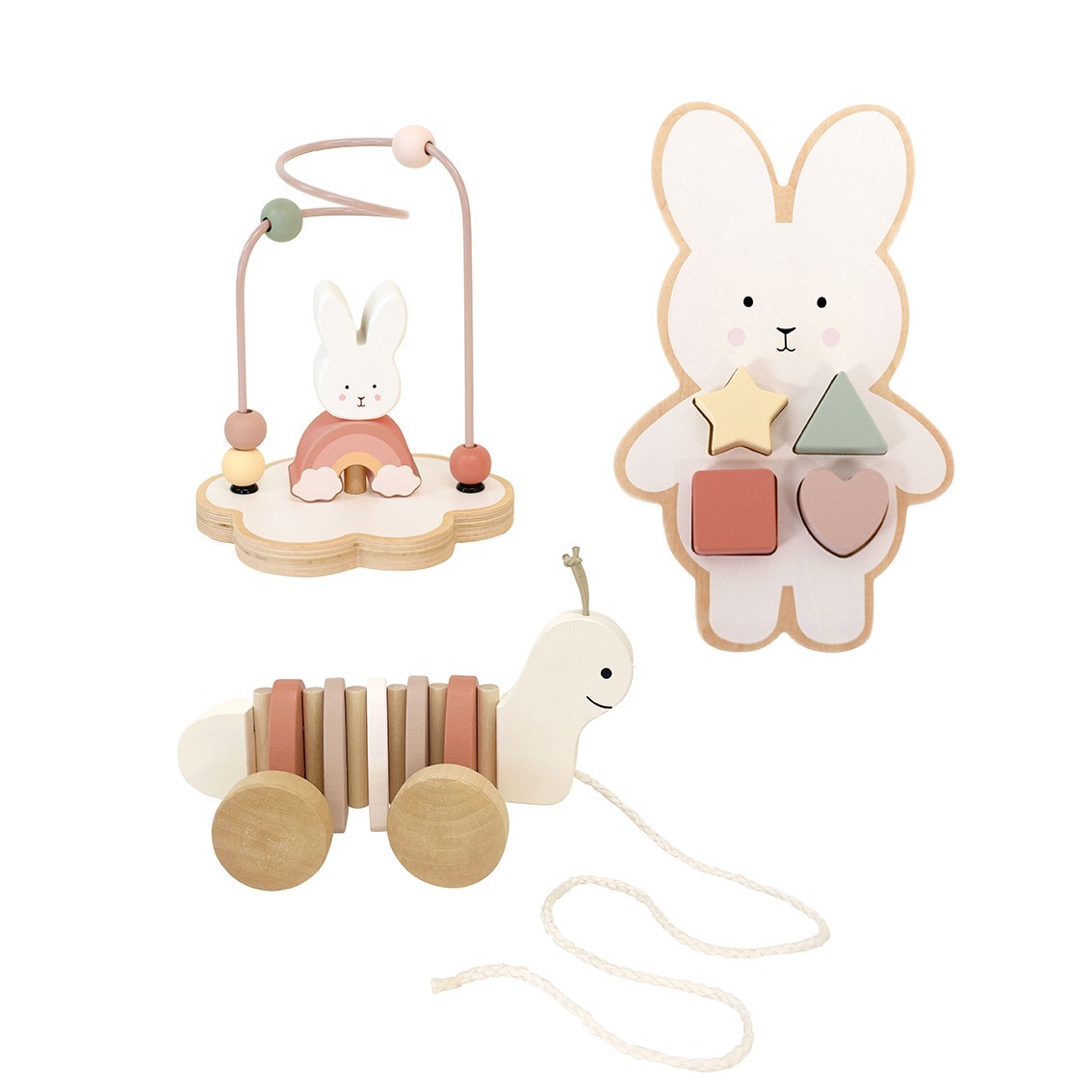 • Obsahuje tři dřevěné hračky: tahací hračku, puzzle tvarů a labyrint s korálky