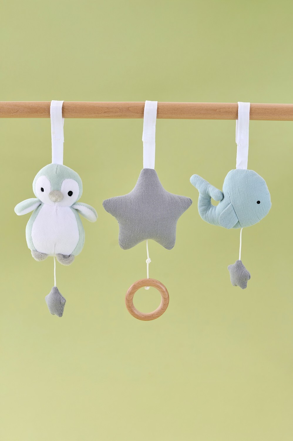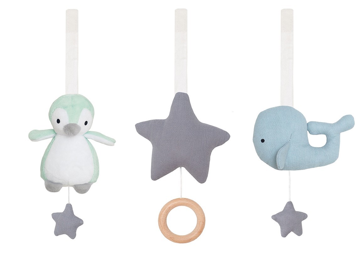 • Roztomilé a měkké postavičky – hvězda s ukolébavkou, tučňák a velryba s chrastítkem
