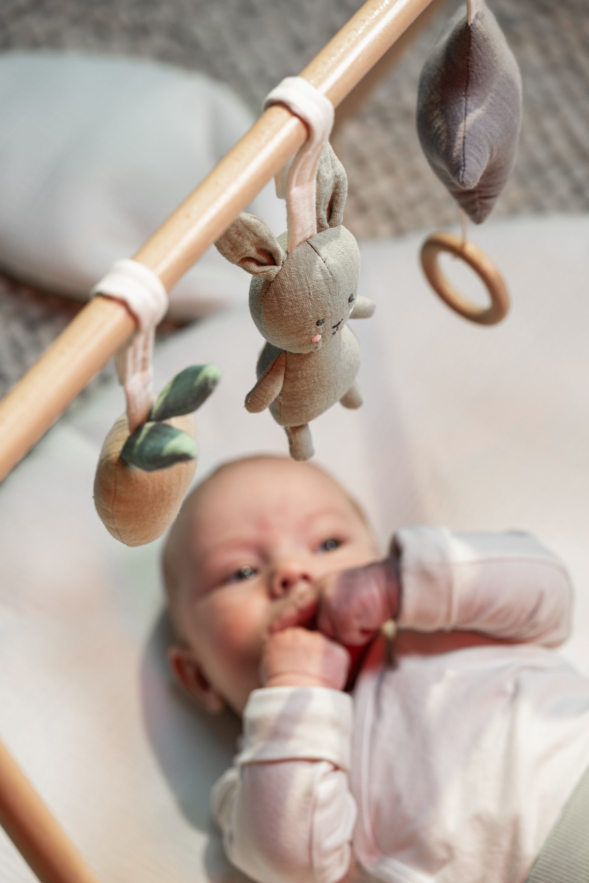 • Snadné připevnění a přesunutí mezi různými hrazdičkami, baby gymy nebo postýlkami díky suchému zipu