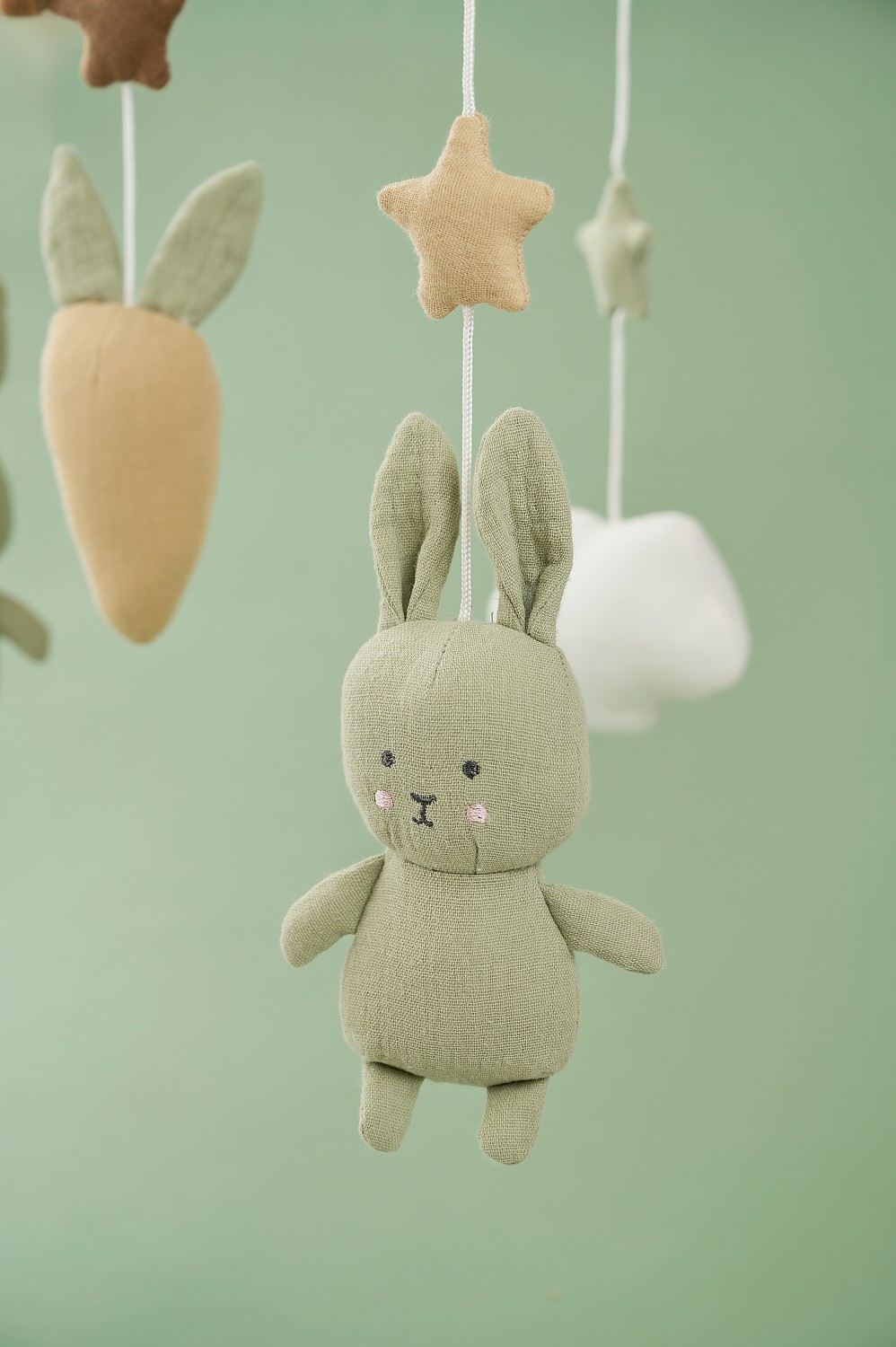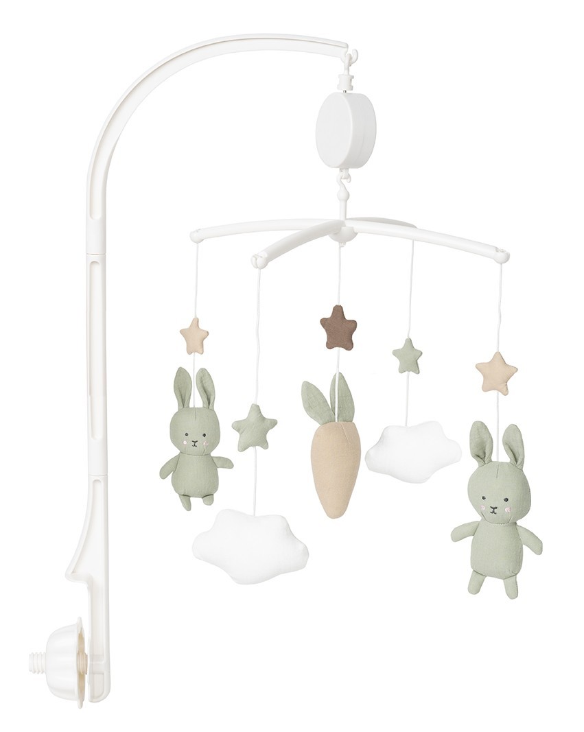 • Roztomilé postavičky – dva zajíčci, mraky, hvězdičky a mrkev, které se pomalu otáčejí při přehrávání hudby