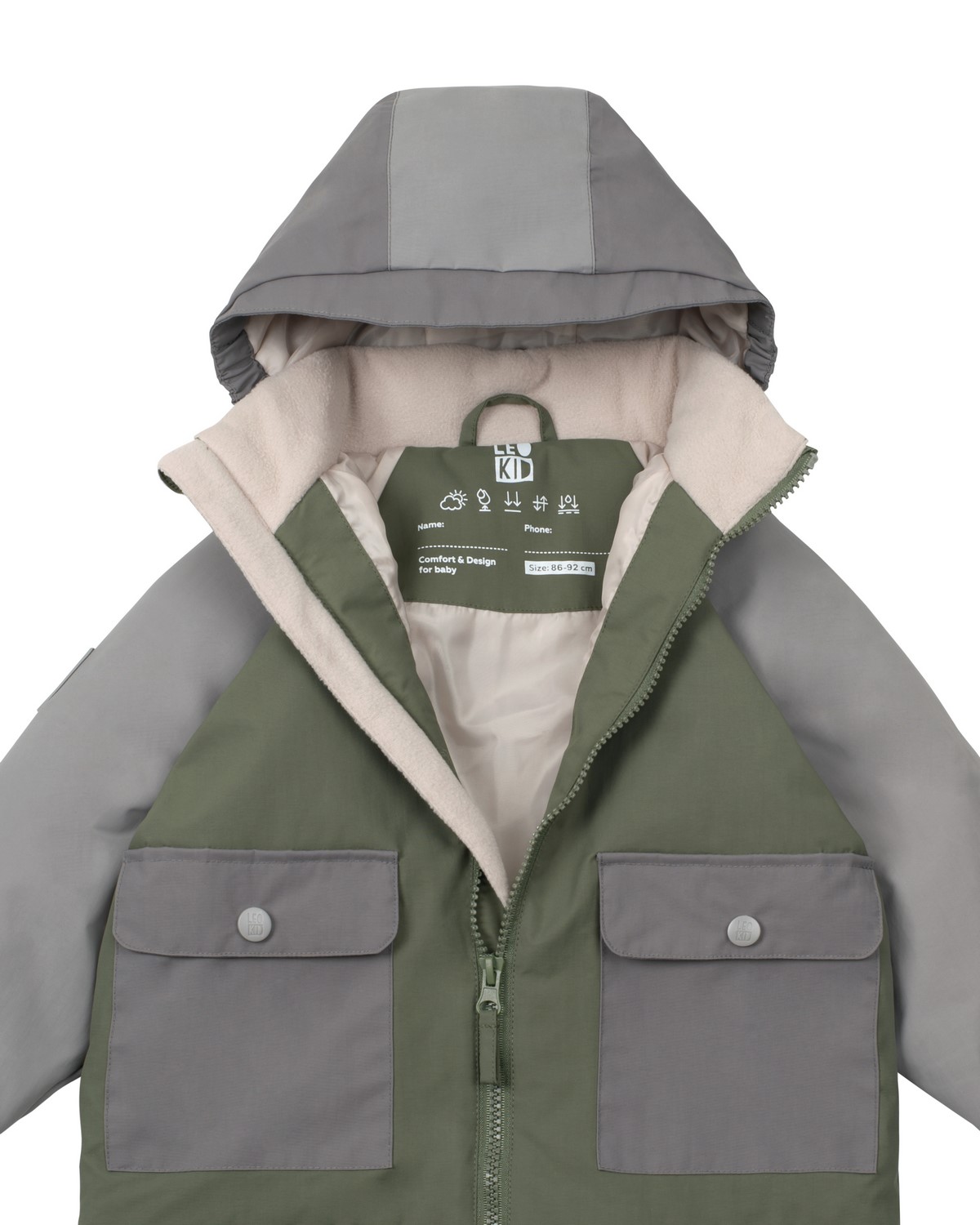 příslušenství: plastový zip s kovovým jezdcem, kovové knoflíky s plastovým kloboučkem
