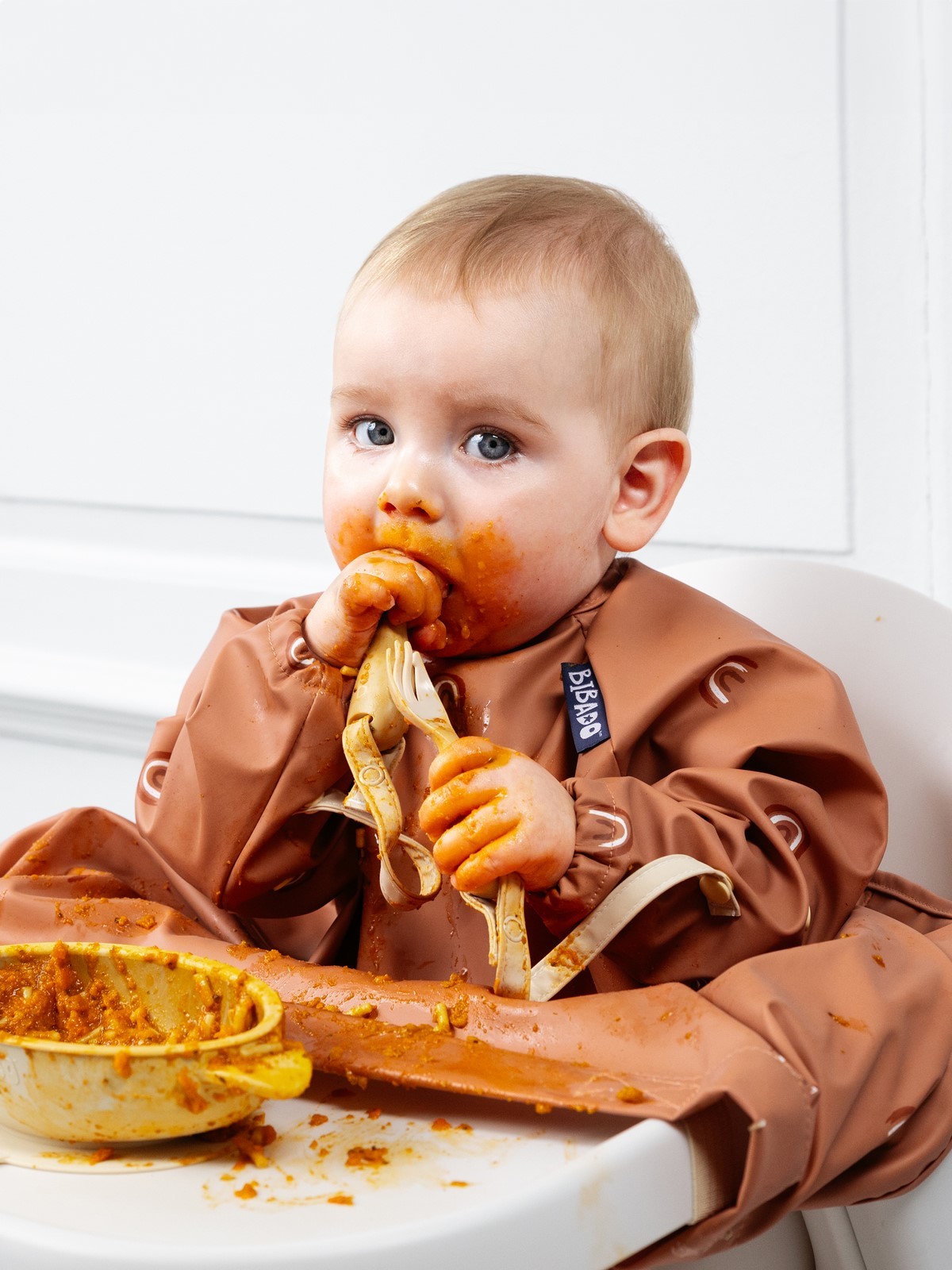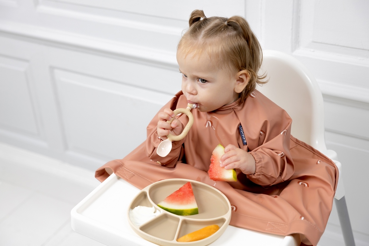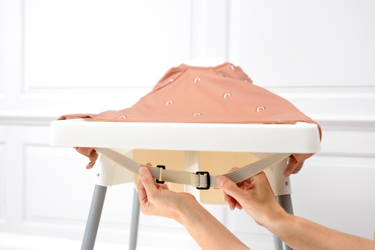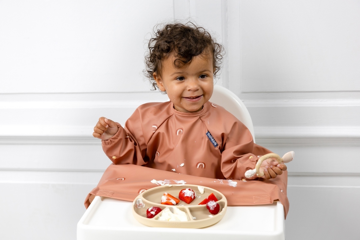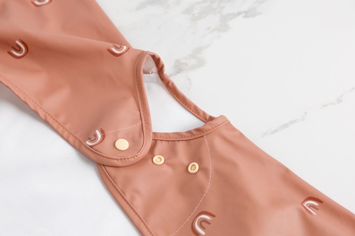 • integrovaný pásek pomůže navléknout spodní část bryndáku na pultík u jídelní židličky, dítěti tak nepadají zbytky jídla do klína a na oblečení