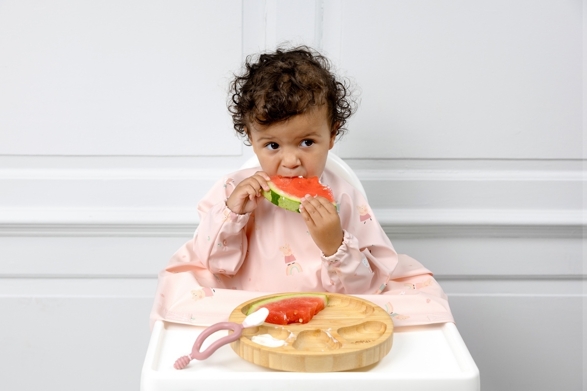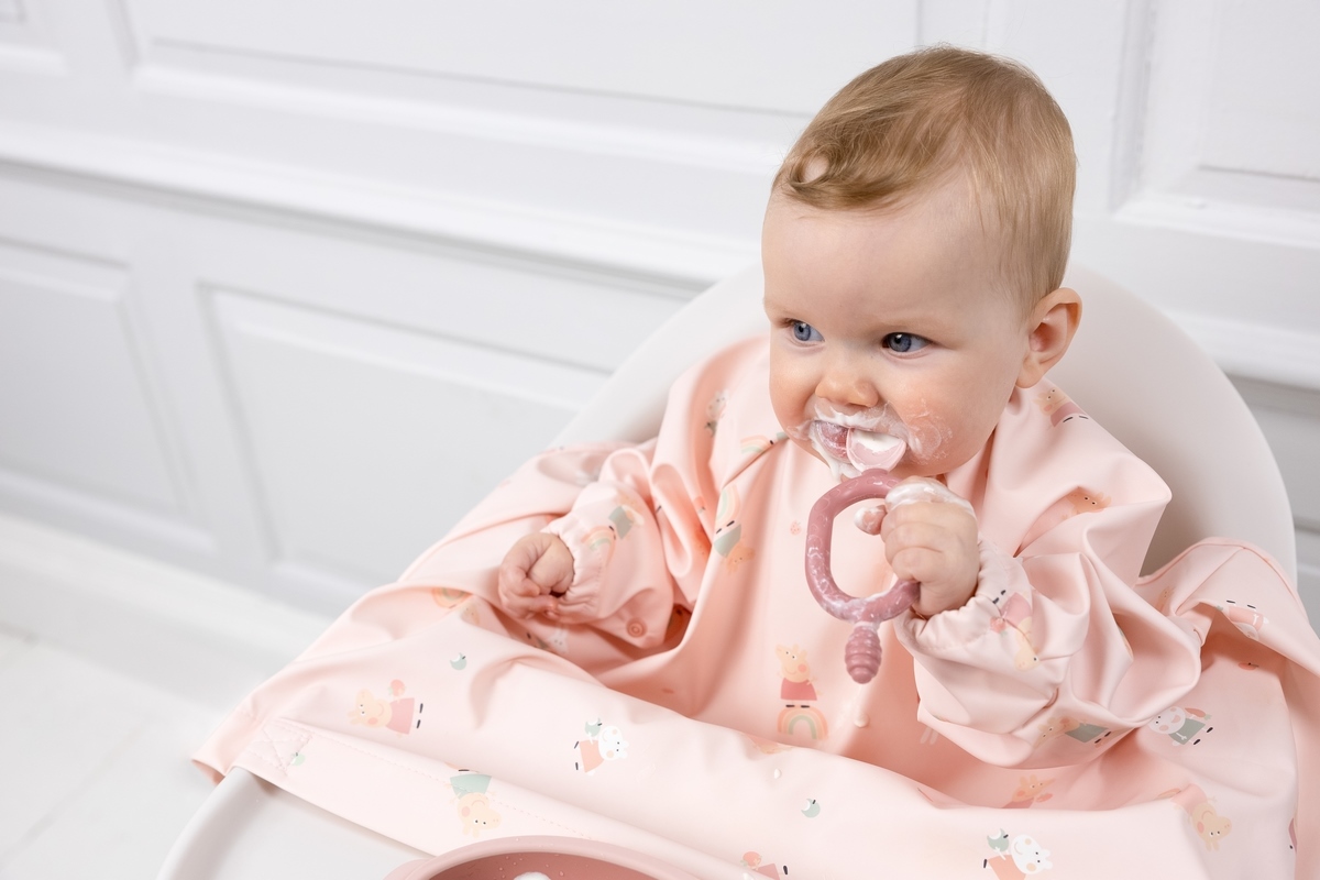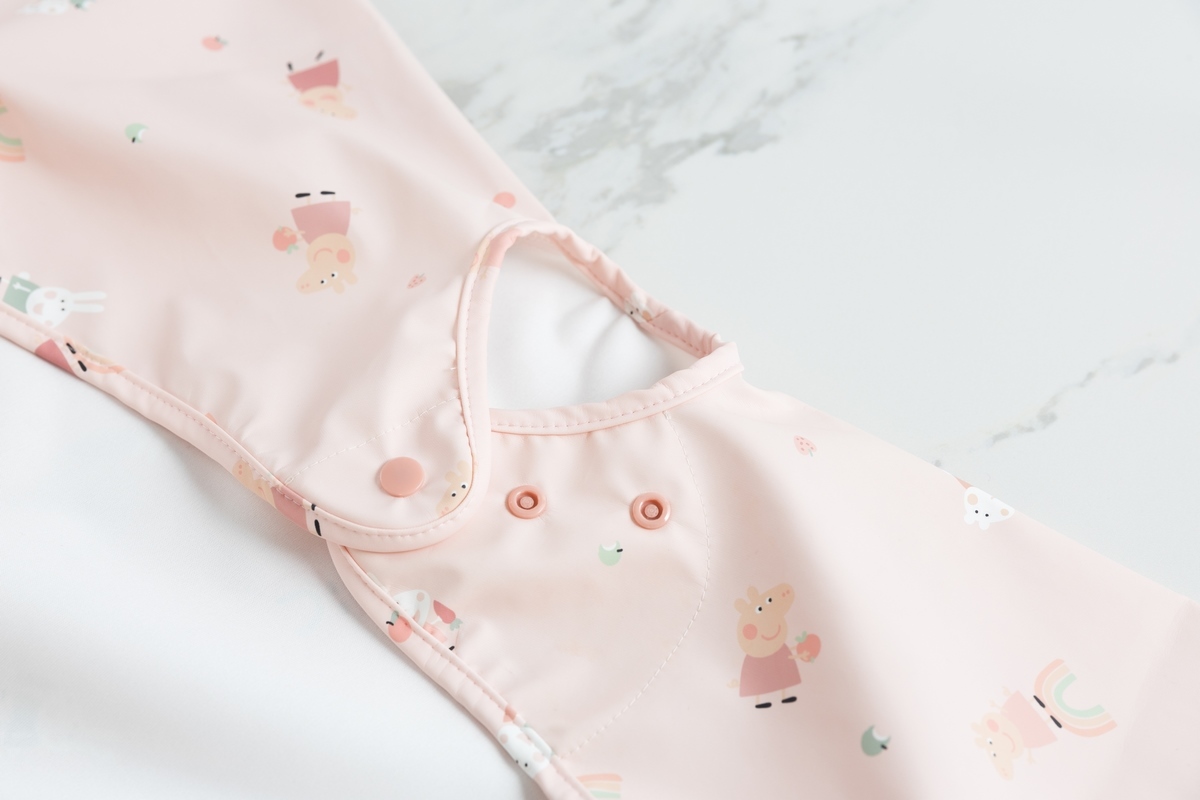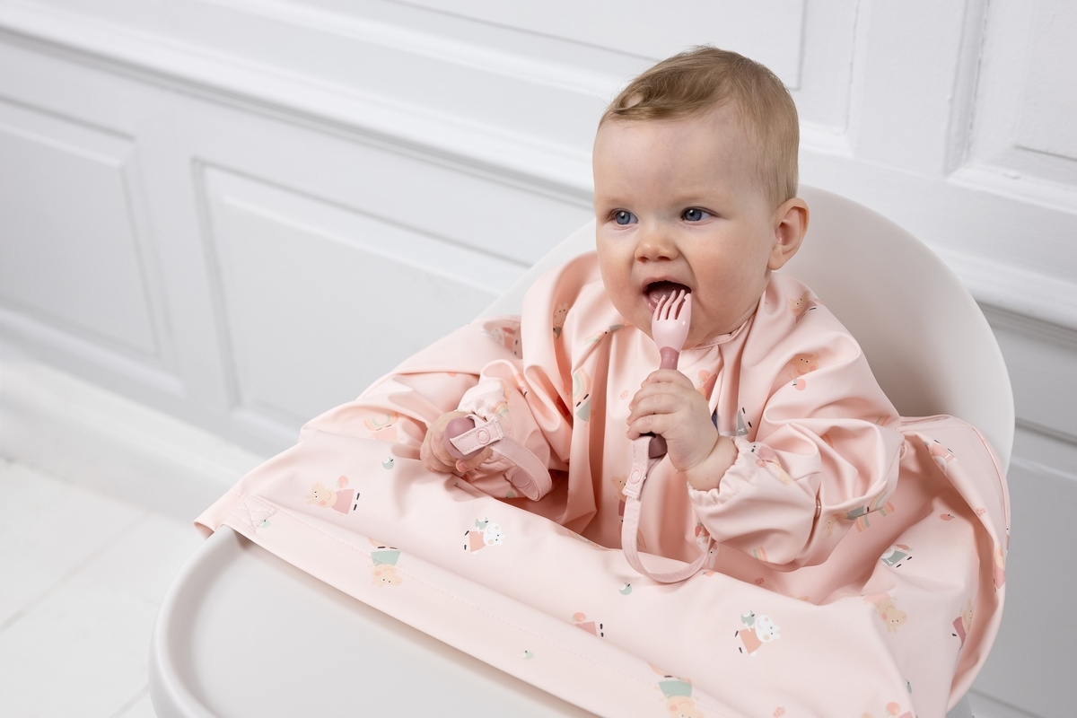 • integrovaný pásek pomůže navléknout spodní část bryndáku na pultík u jídelní židličky, dítěti tak nepadají zbytky jídla do klína a na oblečení